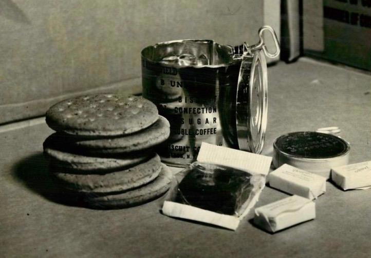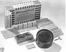 Рацион “К” — самый компактный из всех — состоит из трех упаковок карманного размера, завернутых в целлофан, с надписями “Завтрак”, “Обед” и “Ужин” и общим весом около 2½ фунтов. В каждой упаковке содержится мясо или заменитель белка, два вида печенья, напиток из растворимого порошка, концентрированная конфета и несколько сигарет. Мужчина может съесть яичницу с ветчиной и кофе на завтрак, бутерброды с сыром и лимонад в полдень, а вечером чашку бульона и мясо одного из восьми различных сортов.