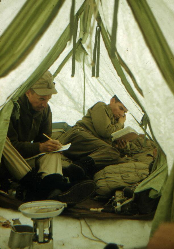 Двухместная арктическая палатка, реверсивная для маскировки, весит всего 7 фунтов, включая шесты, и достаточно прочна, чтобы выдержать шторм протяженностью сто миль на гребне горы Вашингтон.