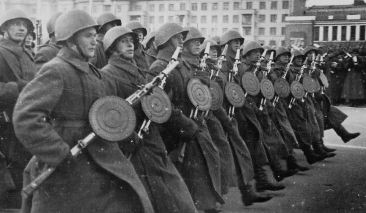 Пехота на параде в Куйбышеве и бойцы с ручными пулеметами Дегтярева