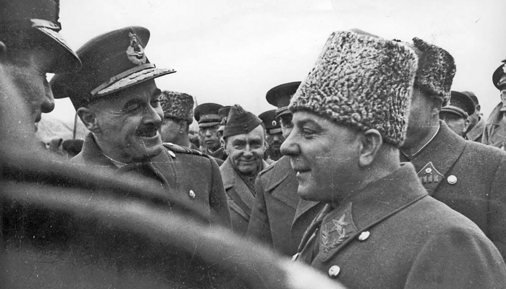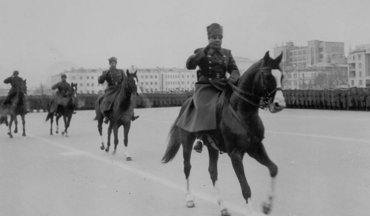 Маршал К. Ворошилов и генерал-лейтенант М. Пуркаев объезжают войска