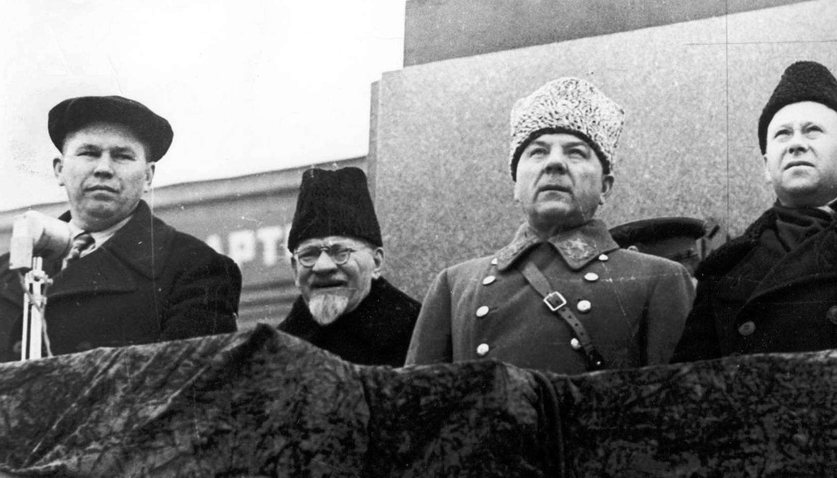 Н.Н Журавлев - председатель облисполкома, М.И. Калинин - председатель Президиума Верховного Совета СССР и маршал К.Е. Ворошилов на параде в Куйбышеве
