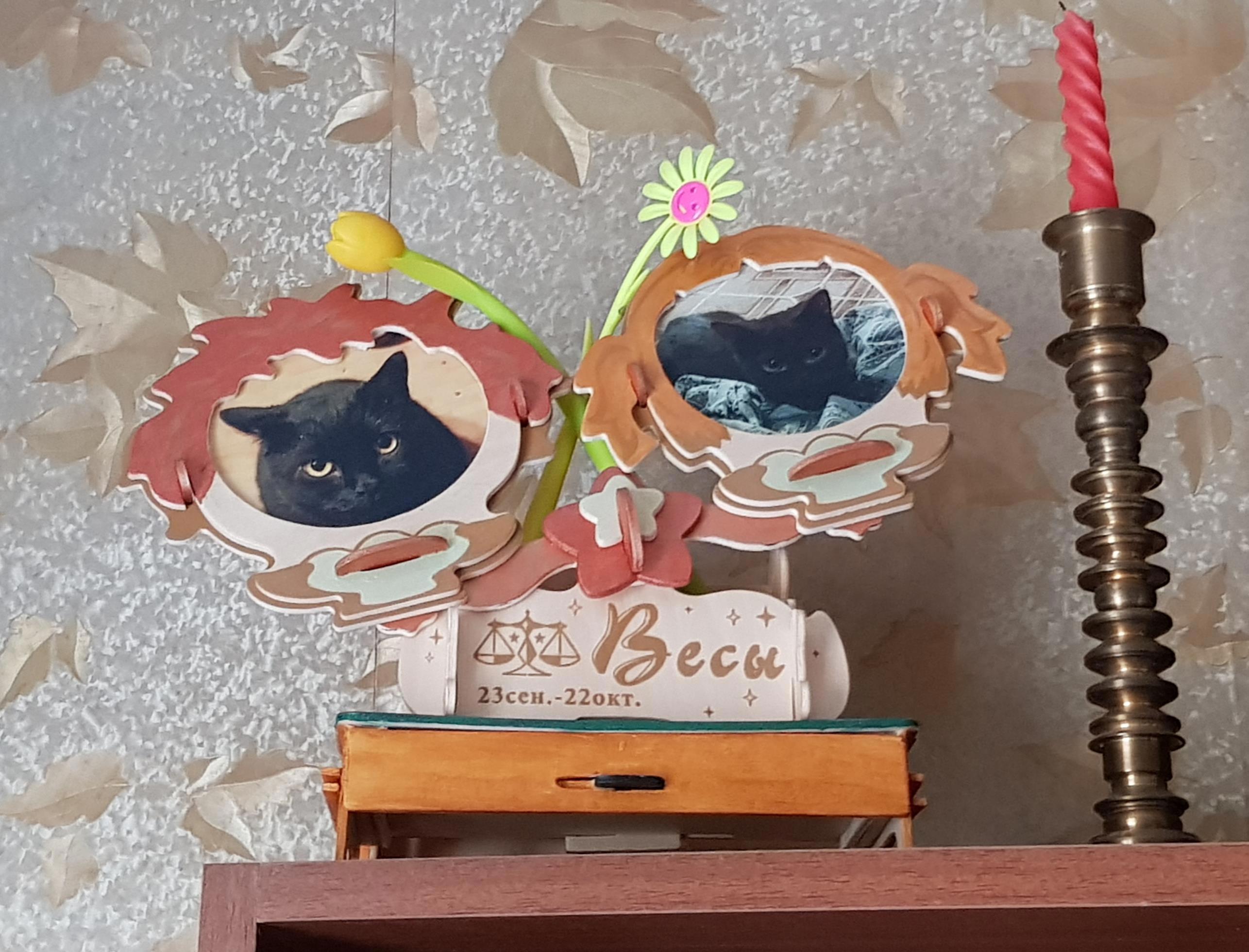 Ящичек для хранения котячьих когтей и усов, а также фоторамка с теми самыми котями, стоящая сверху