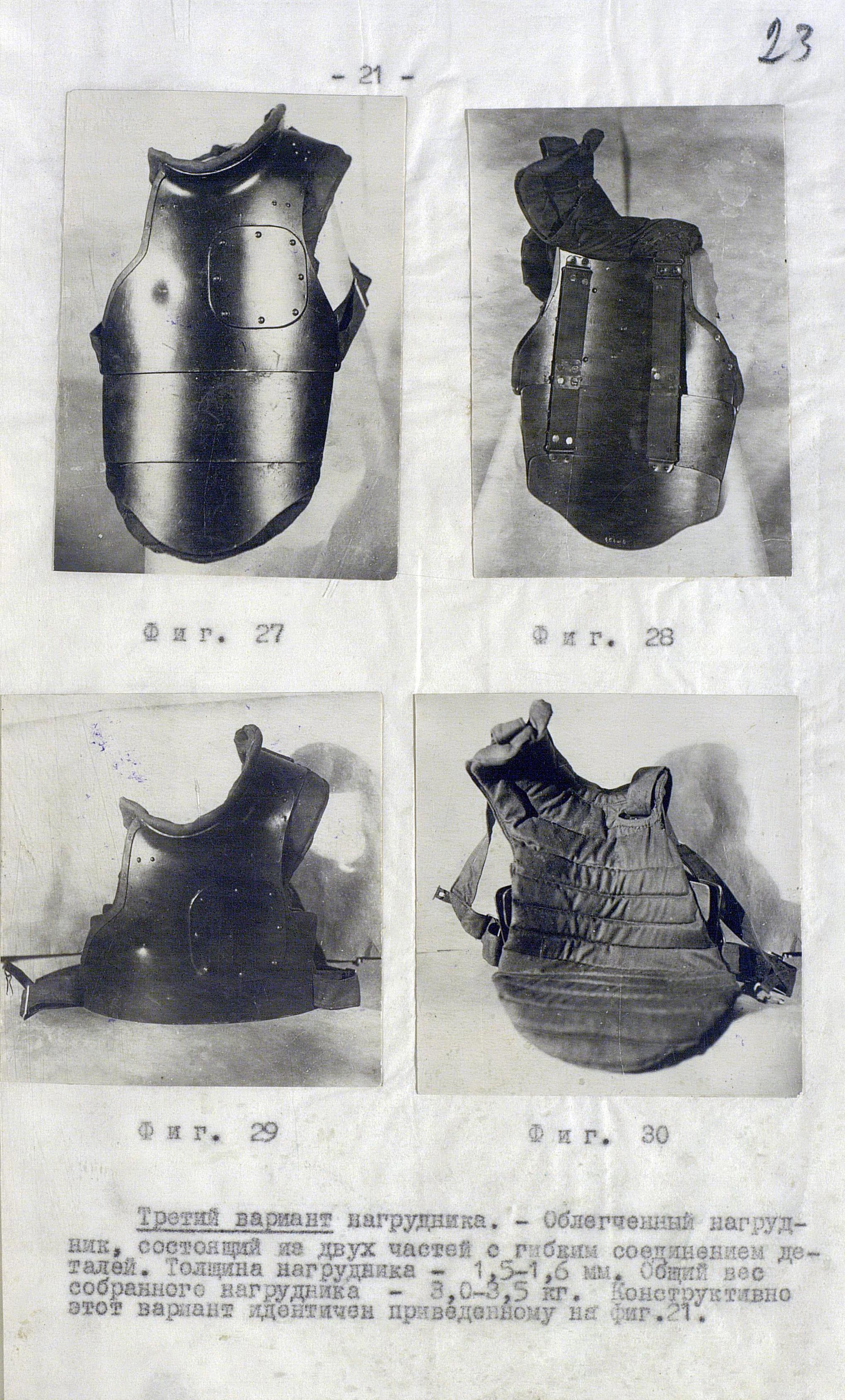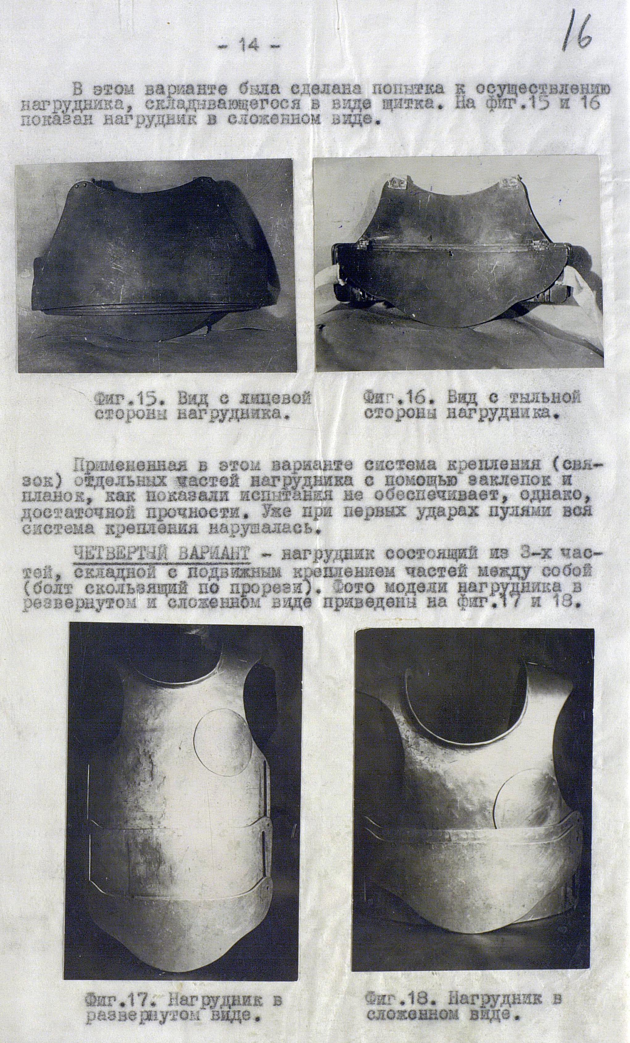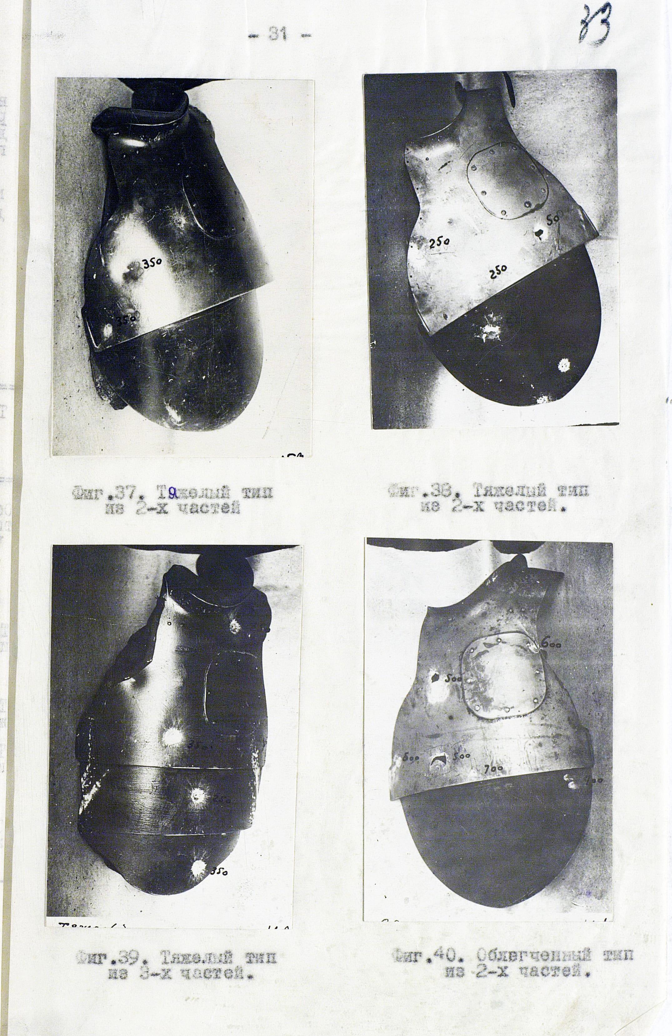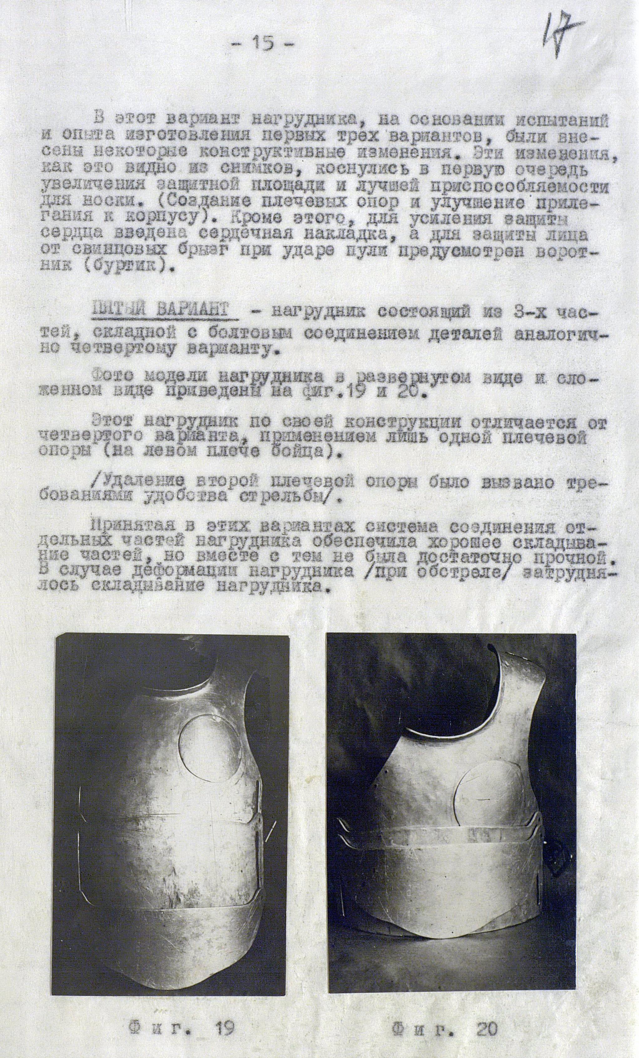 Соответствующие материалы были нами подготовлены и направлены Народному Комиссару Вооружений вместе с проектом технических условий на измененный образец нагрудника СВ-40 обеспечивающий защиту с дистанции 175 метров против дистанции 350 метров для нагрудника СН-39. эти материалы /наше отношение № 955с от 16.IV и 1398с от 4. VI, по существу и являлись техническим отчетом по настоящей работе, поскольку работа могла продолжаться лишь при условии принятия нагрудников на вооружение.