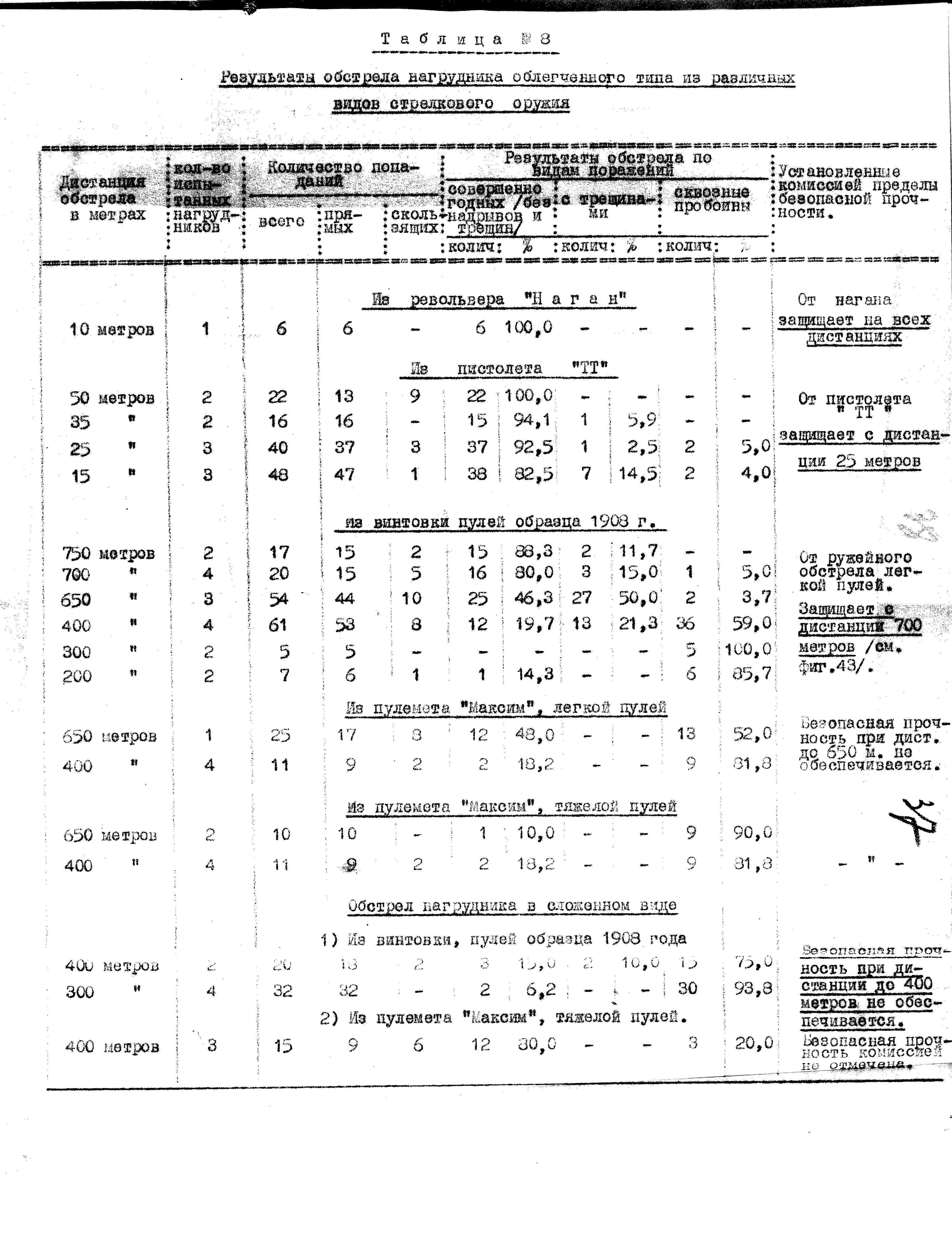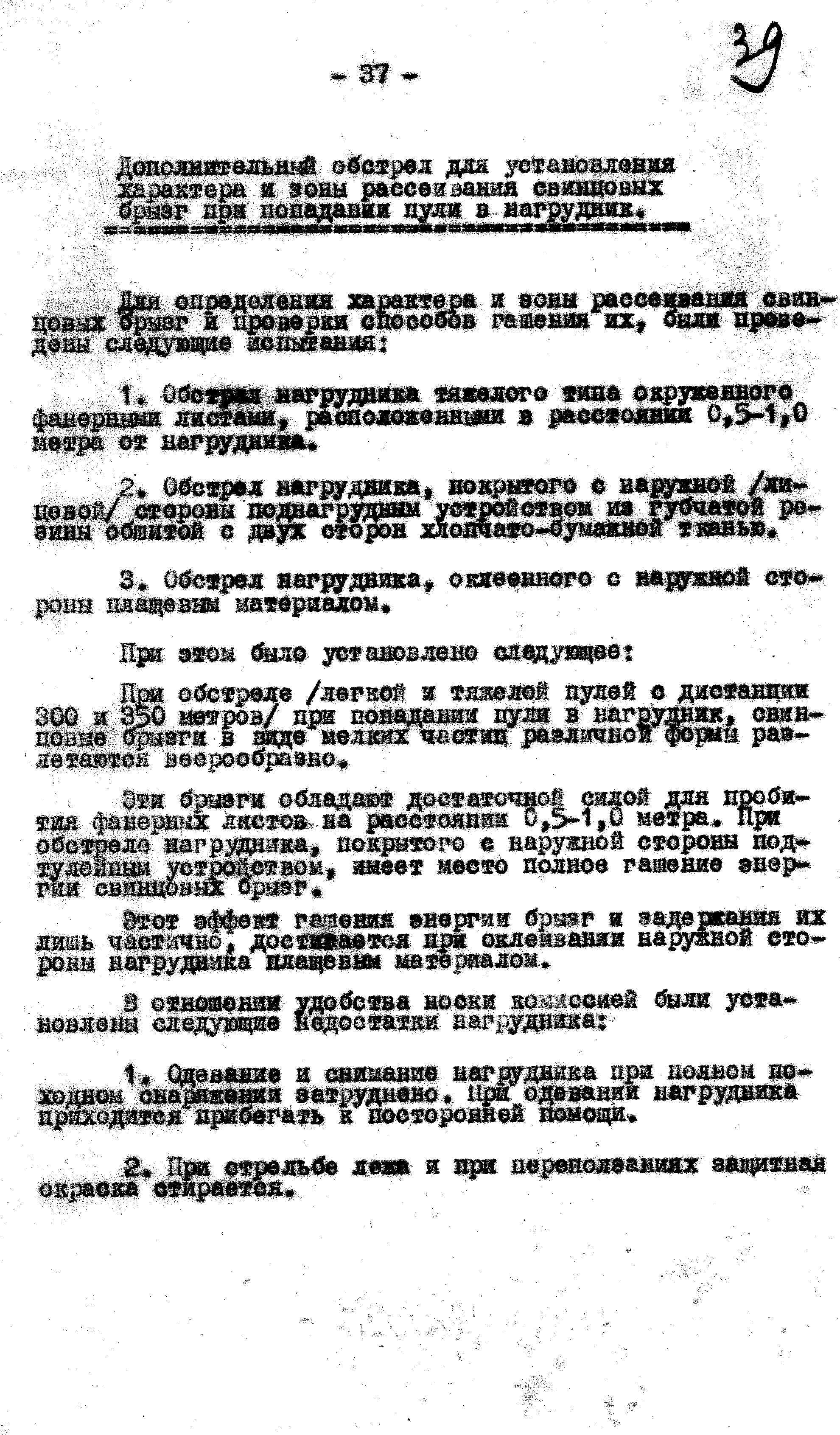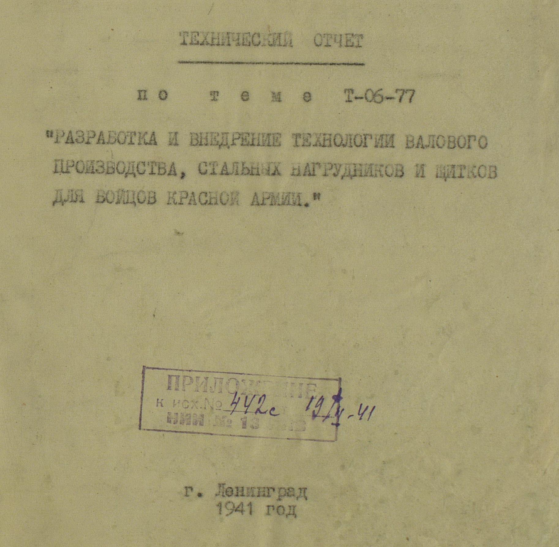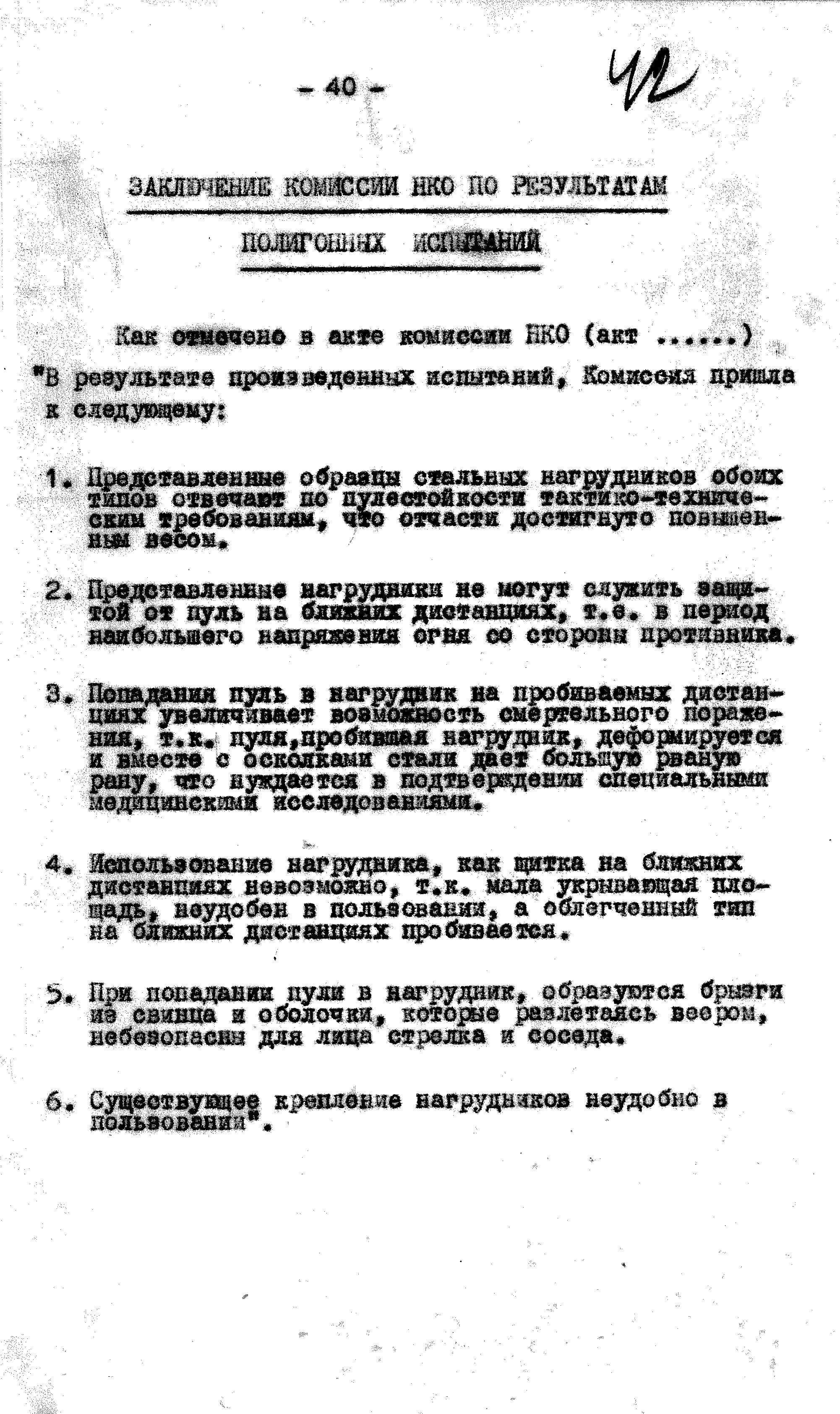 Соответствующие материалы были нами подготовлены и направлены Народному Комиссару Вооружений вместе с проектом технических условий на измененный образец нагрудника СВ-40 обеспечивающий защиту с дистанции 175 метров против дистанции 350 метров для нагрудника СН-39. эти материалы /наше отношение № 955с от 16.IV и 1398с от 4. VI, по существу и являлись техническим отчетом по настоящей работе, поскольку работа могла продолжаться лишь при условии принятия нагрудников на вооружение.