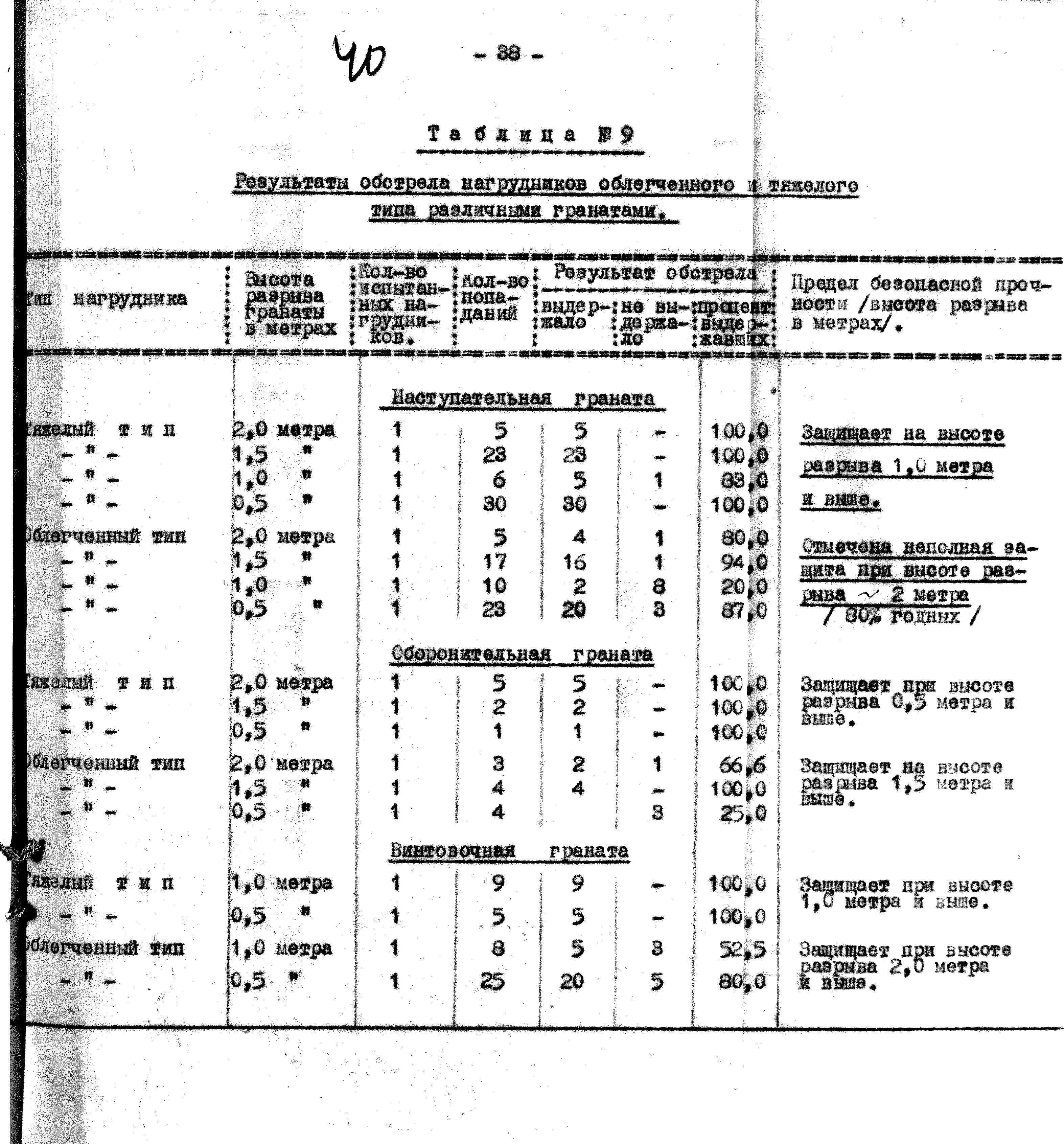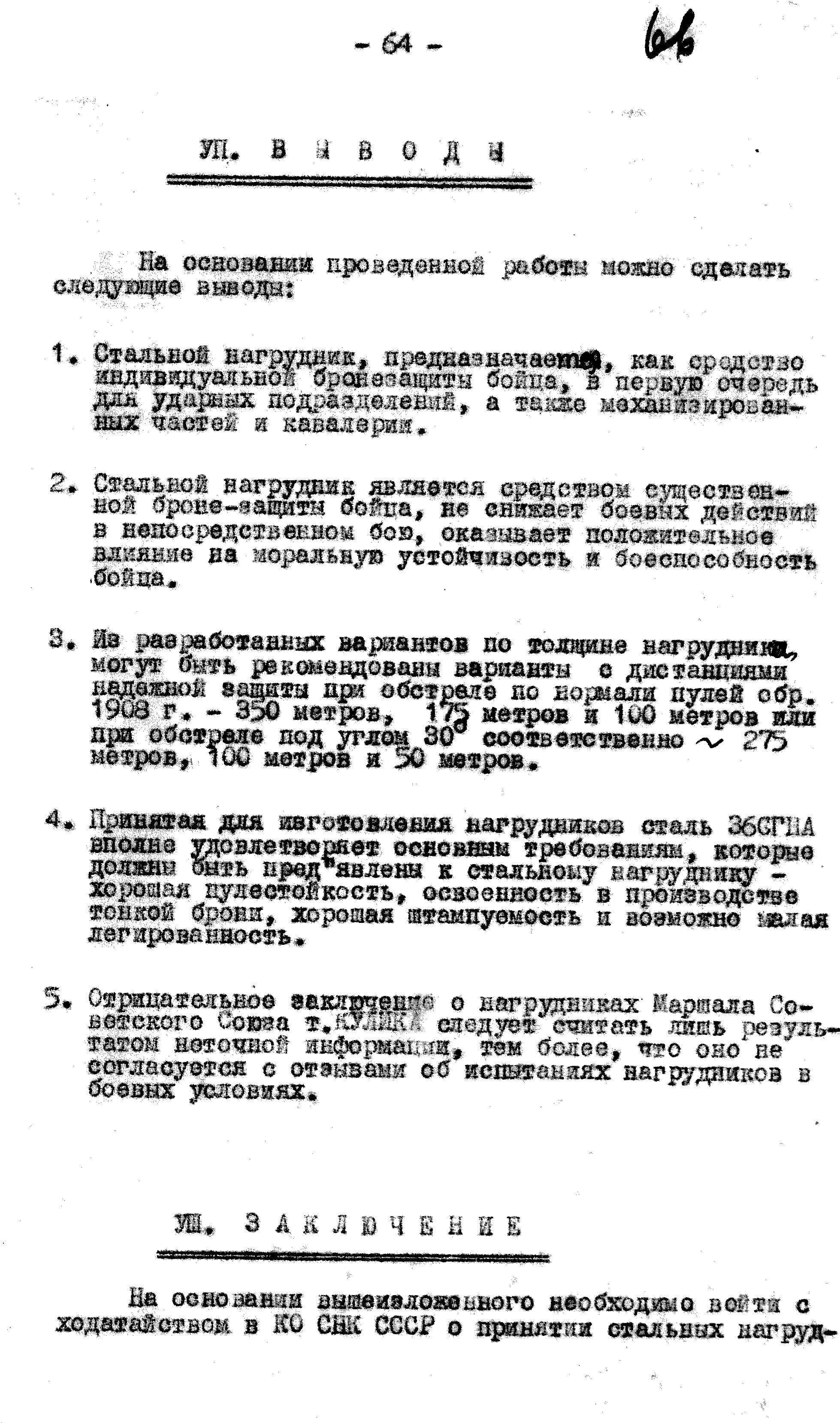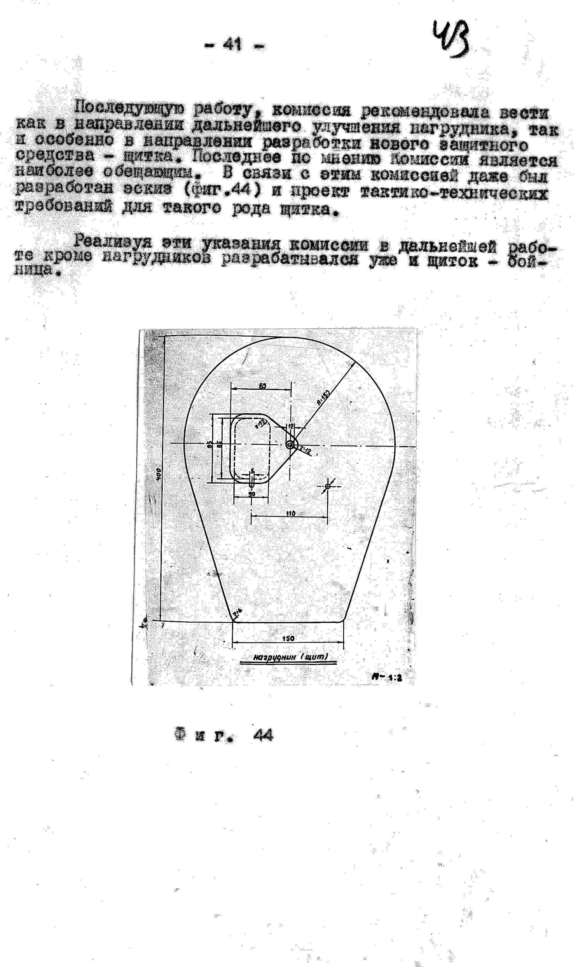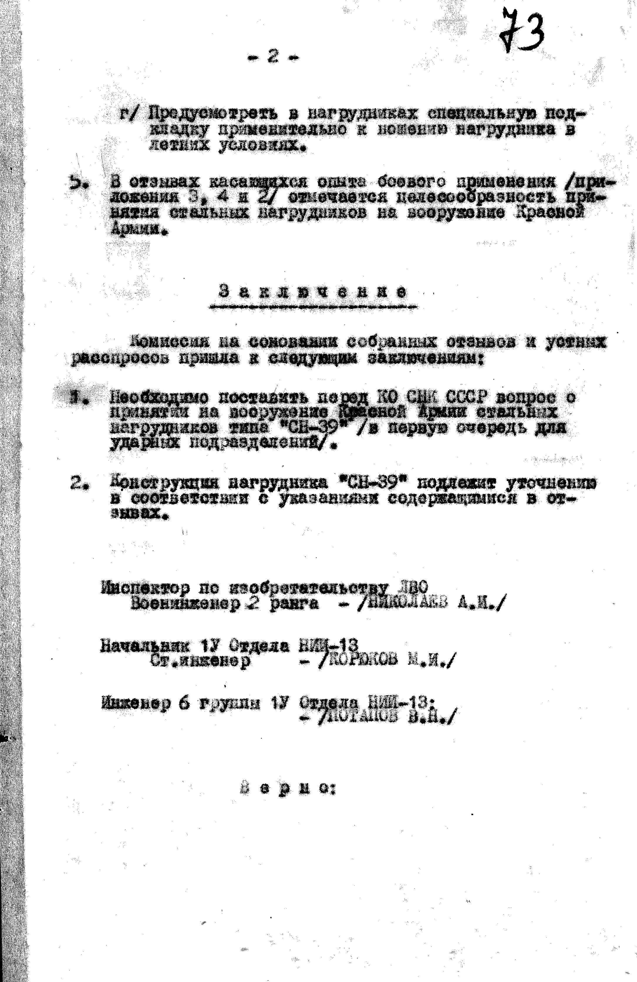 Соответствующие материалы были нами подготовлены и направлены Народному Комиссару Вооружений вместе с проектом технических условий на измененный образец нагрудника СВ-40 обеспечивающий защиту с дистанции 175 метров против дистанции 350 метров для нагрудника СН-39. эти материалы /наше отношение № 955с от 16.IV и 1398с от 4. VI, по существу и являлись техническим отчетом по настоящей работе, поскольку работа могла продолжаться лишь при условии принятия нагрудников на вооружение.