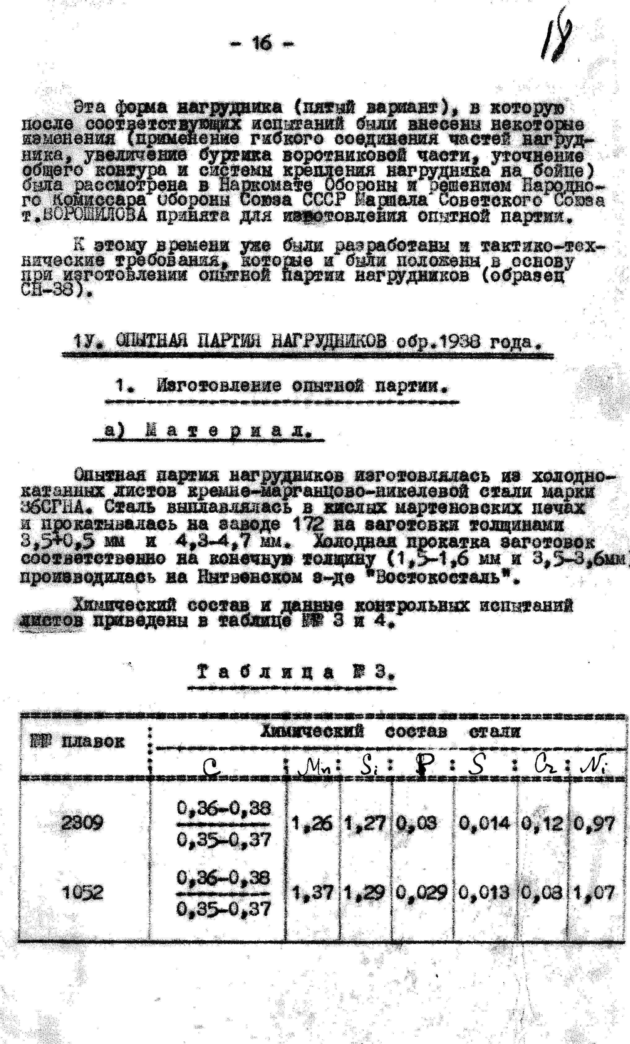 В первый период работ с нагрудниками, наряду с разработкой и опробованием различных конструктивных вариантов, проводилось и изыскание марки стали для нагрудников.