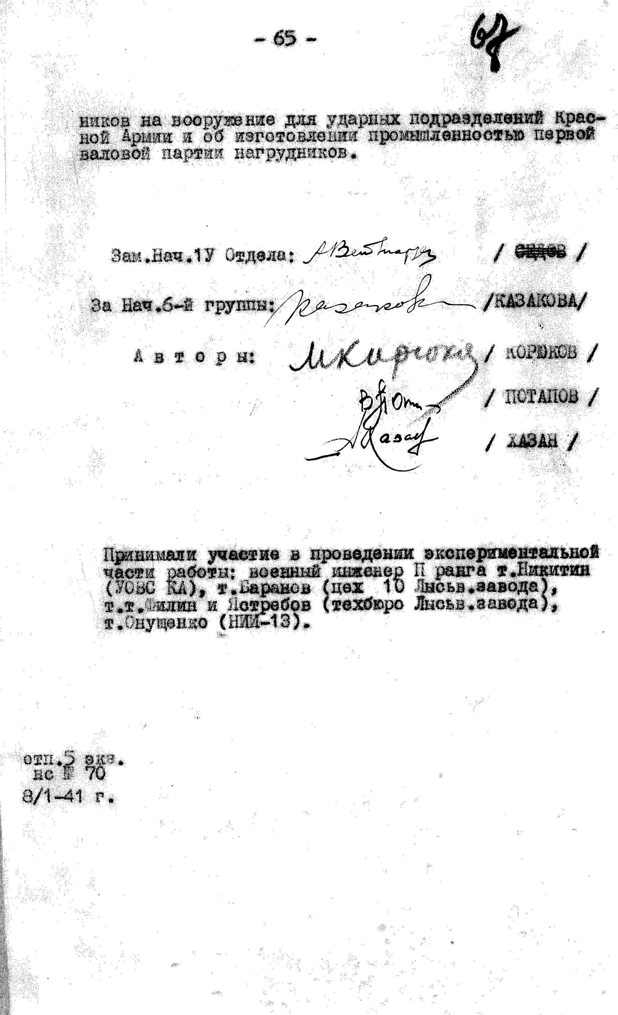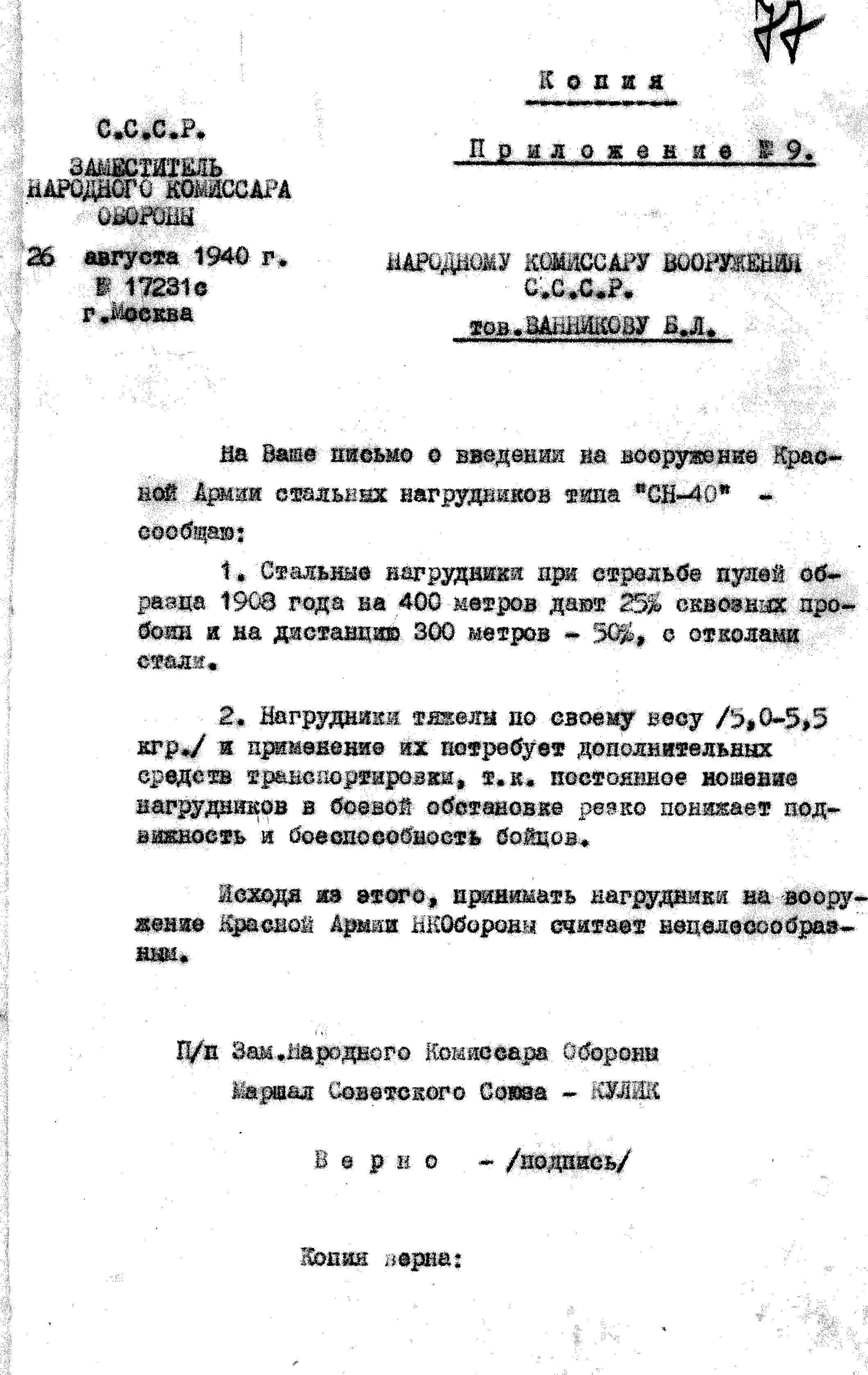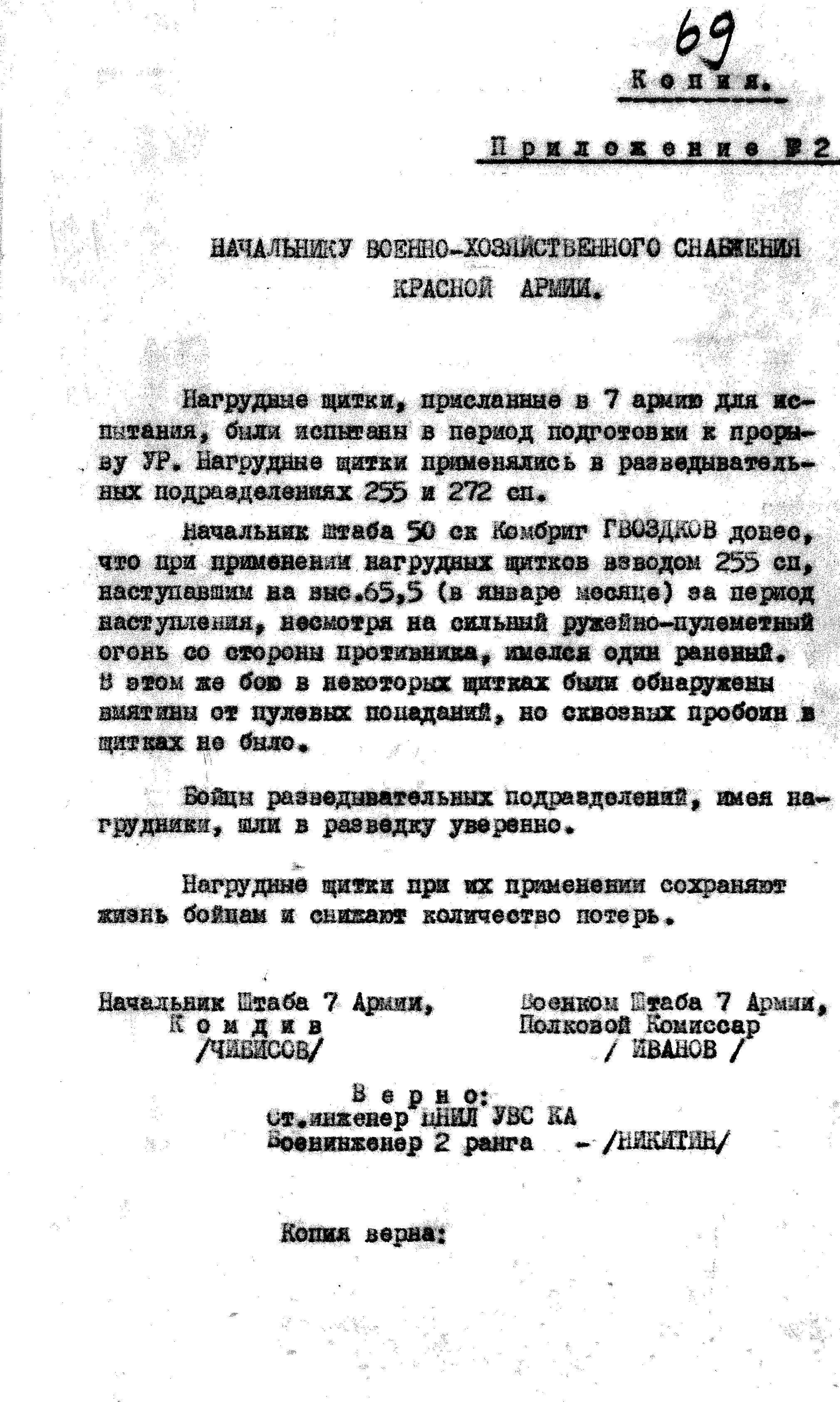 Результаты испытаний нагрудников в боевых условиях и отзывы о них Начальника и Военкома 7-ой армии, были доложены Народному Комиссару Вооружений т. ВАННИКОВУ и согласно его письма № 592с от 28/IV/ 1940 г. признана вполне удовлетворительными».