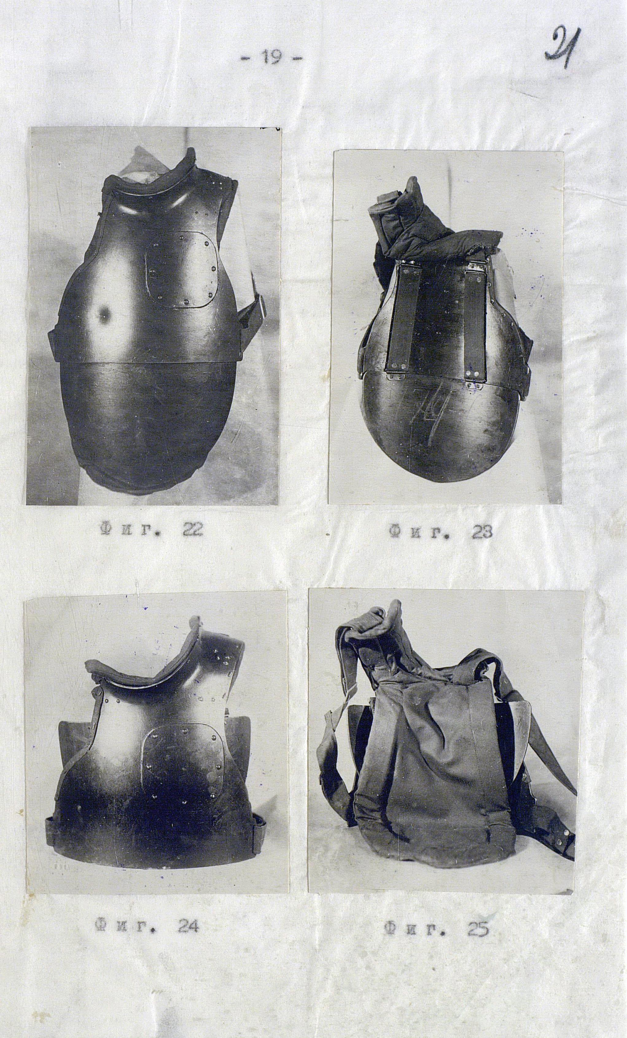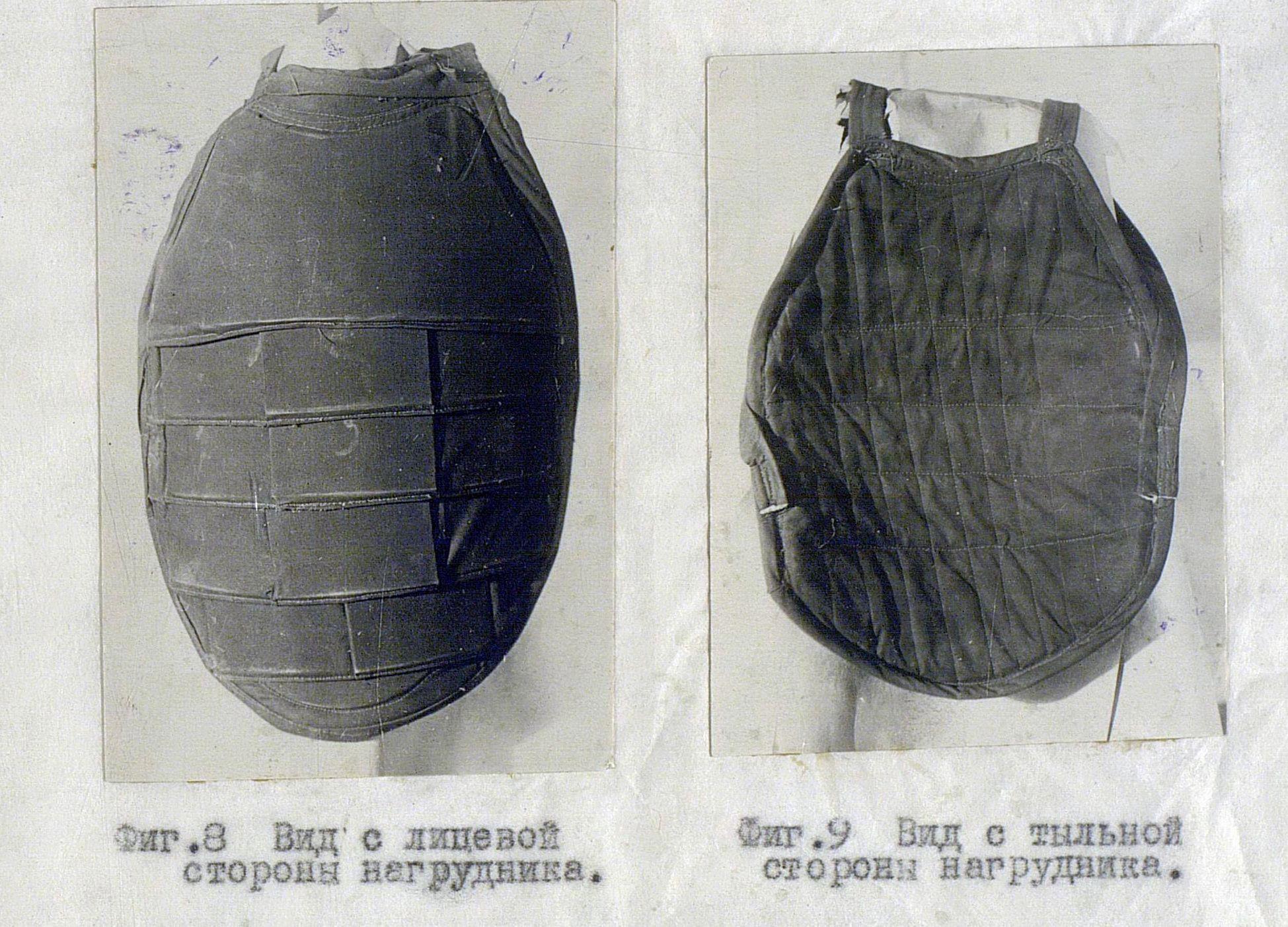 В работе «О защитной роли шлемов и нагрудников», выполненной в -Ленинградской Военно-Медицинской Академии военврачами Поповым и Порарейшвили пря консультации профессора Добротворского, Заслуженного деятеля наук проф. Шевкуненко и проф. Данилина на основе опытов, проведённых на животных, делаются след. выводы: