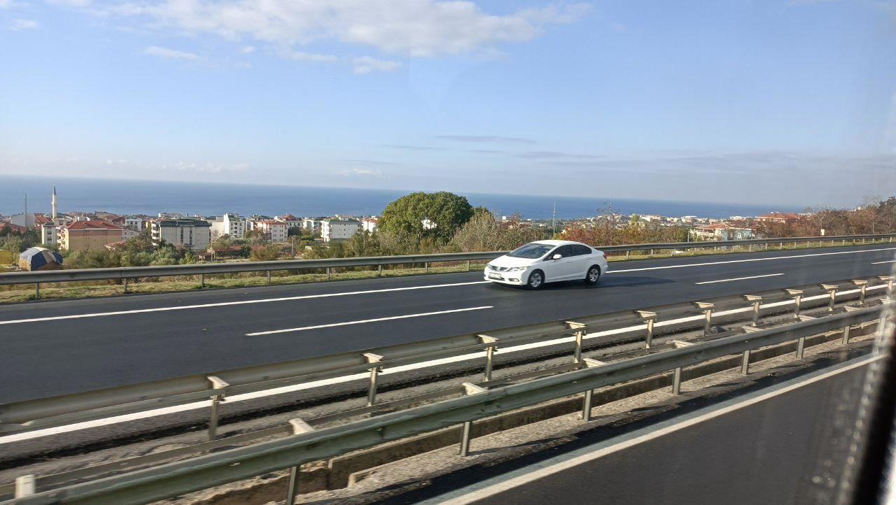 Выезжаем из Стамбула. Дорога прекрасная. Погода - супер. Слева Мраморное море.