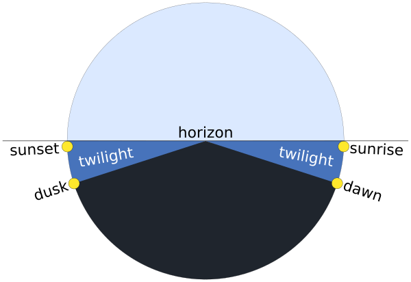 Сумерки (twilight) — время между рассветом (dawn) и восходом (sunrise) или между закатом (sunset) и темнотой (dusk)