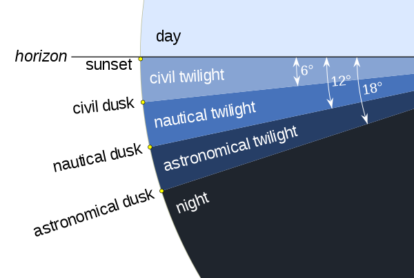 В зависимости от угла нахождения Солнца под горизонтом различают гражданские, навигационные и астрономические сумерки.