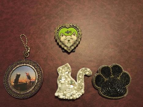 Сборная солянка, уехавшая на ПМЖ к другу Элсэртису) Котя с рыбкой - крестиком в ажурной рамочке, питерский мост - по перфорированной канве, а лапка и белая кошь - по фетру бисером и бусинами