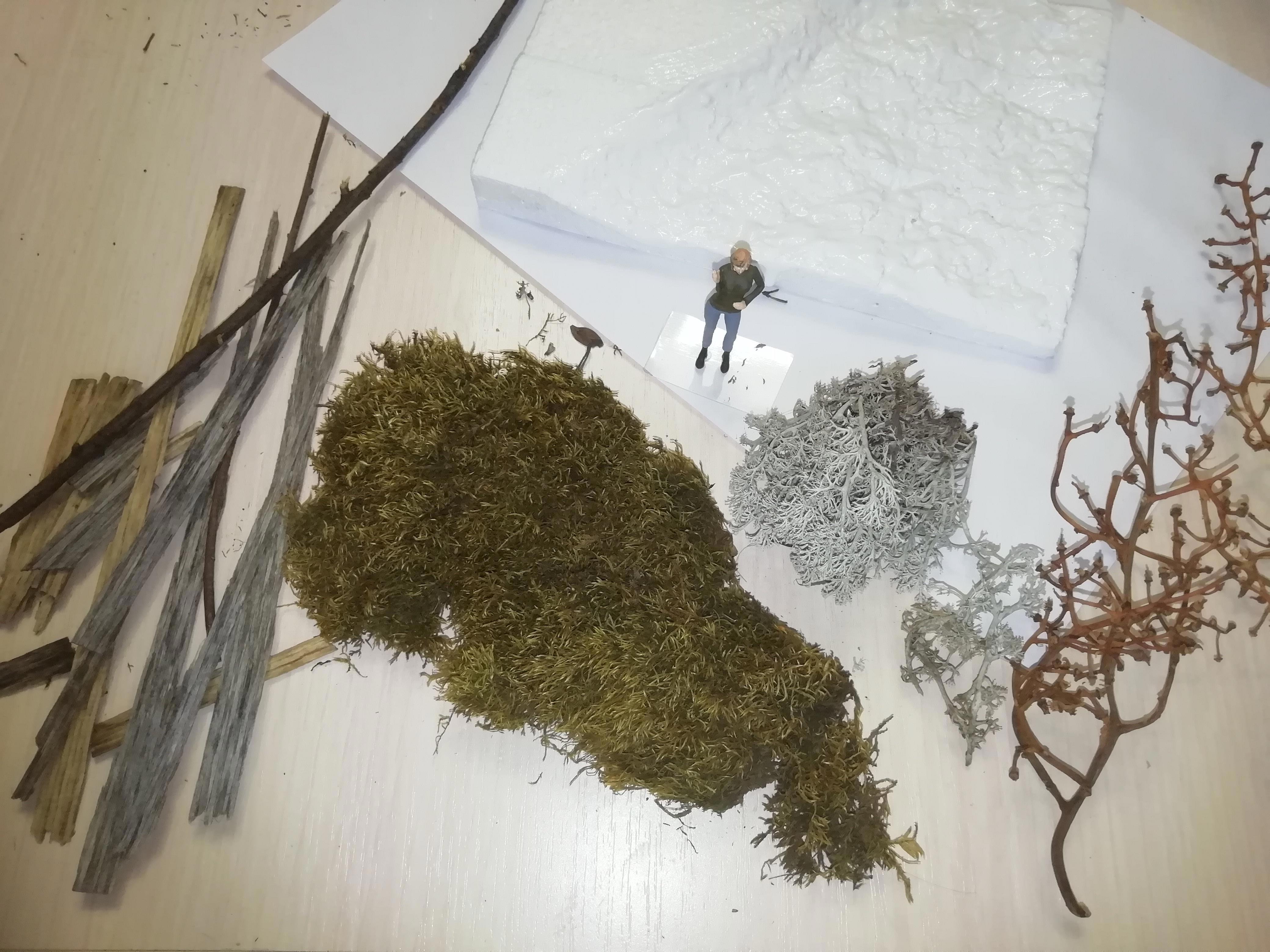 Ну и пора готовить материал - мох для травы, лишайник для кустов, виноградные веточки как кандидаты в деревья (поглядим, как будет смотреться).