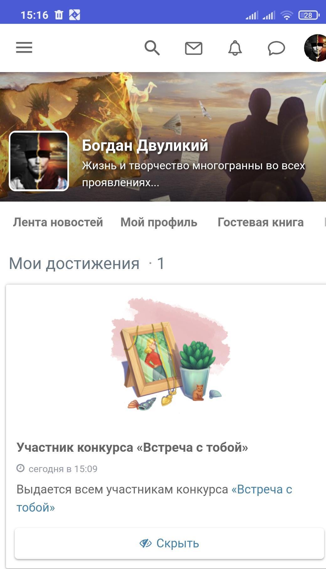 Автор: Богдан ДвуликийМелочь, а приятно - получить ачивку за какое-то действие. Сегодня пришло системное уведомление, что я получил награду за участие в конкурсе "Встреча с тобой". Пусть конкурс и не самый популярный в рамках сайта, но я придаю ему значение. Да и не только я.
