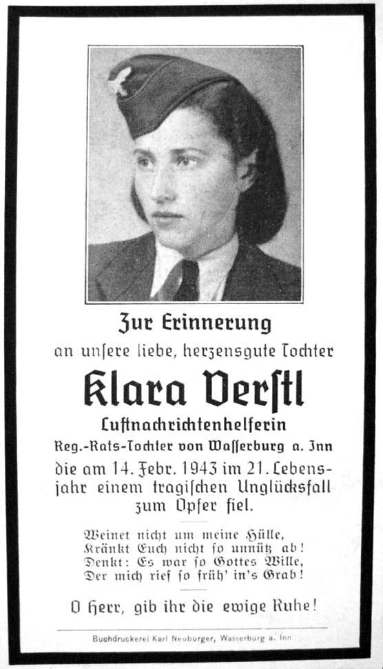 Некролог на Клару Верстль, помощницу Люфтваффе, погибшую в Валентинов день 1943 года.
