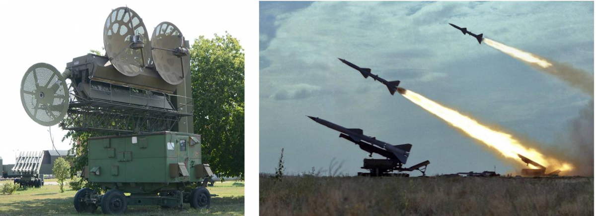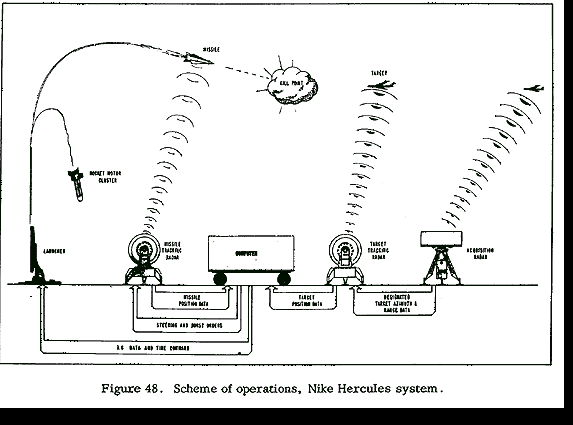 Схема работы американского ЗРК "Найк-Геркулес". Обзорный радар (справа) обнаруживает цель, радар сопровождения цели (в центре) непрерывно ведет ее лучом, радар сопровождения ракеты (слева) ведет лучом взлетевшую ракету. Компьютер в фургоне собирает данные от радаров и посылает команды на ракету.