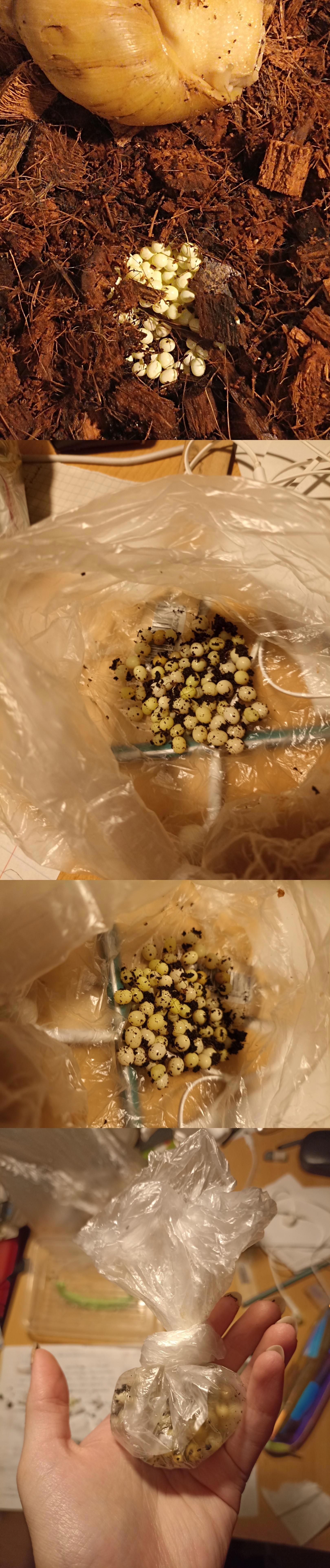 Здесь две кладки: неразорённая ахатины и разорённая архахатины. Просто прикиньте, сколько яиц влезает в одну улитку.