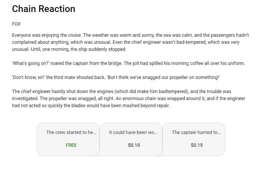 Автор: Юлия МихалеваПолучила предложение от некоего сервиса (не привожу его название, чтобы не выглядело рекламой). Суть довольно интересная: там размещаются интерактивные истории, и для того, чтобы узнать продолжение при определенном выборе, читатель платит (ну, или не платит, а читает бесплатное продолжение). При этом сам сайт выглядит странно, там нет даже меню, контент можно пролистывать только вручную и весь он на английском языке (однако представитель утверждает, что есть и русский, но подтверждения этому не попалось).