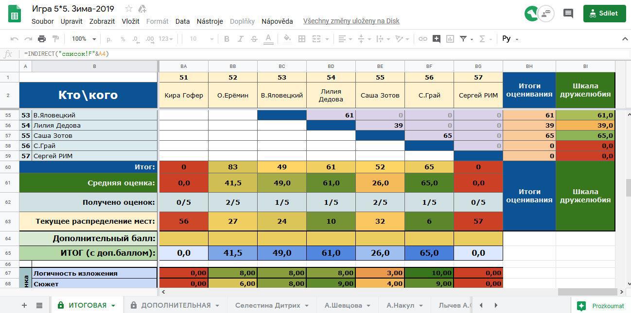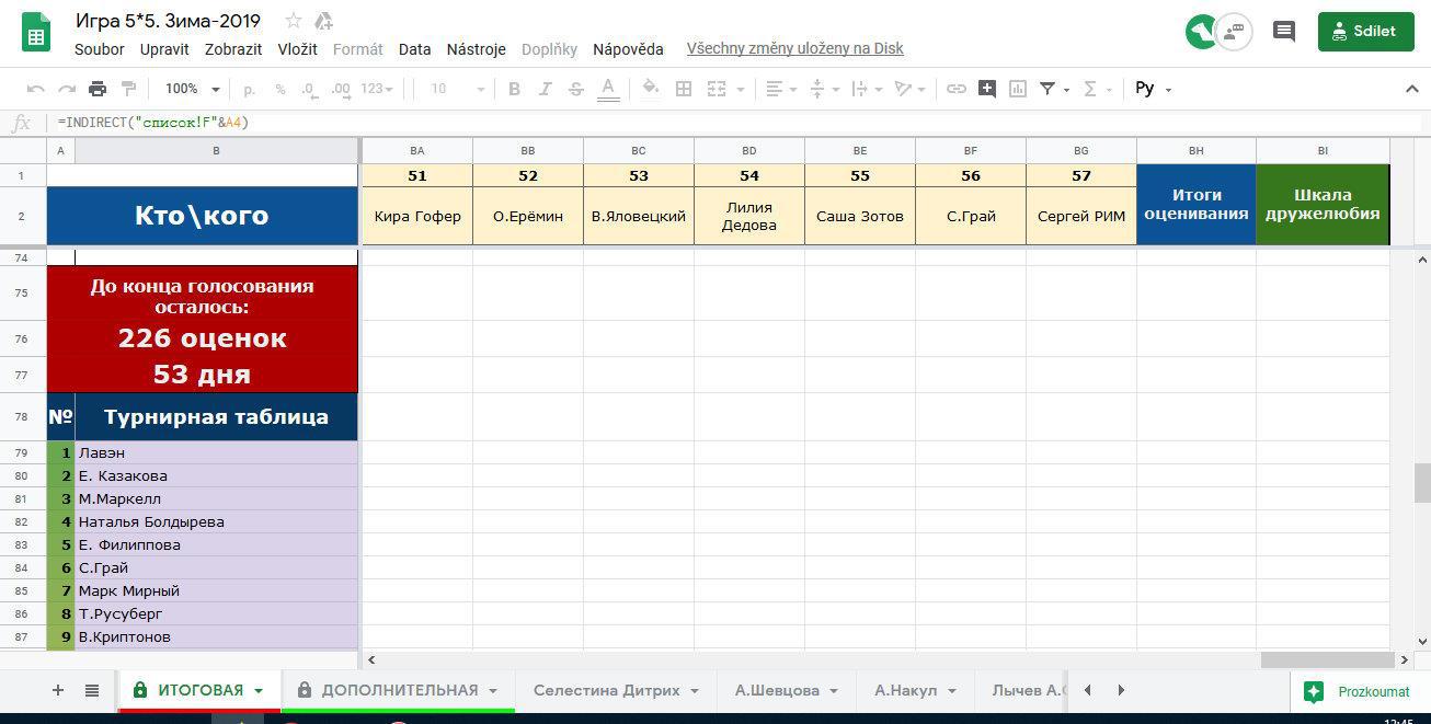 Если подвинем экран с таблицей в крайне правую позицию, то увидим столбцы с суммарными баллами, данными участниками и средний балл в столбце «дружелюбия». По результатом этих баллов будет определяться Добрая Машенька и Баба Яга нашей игры.