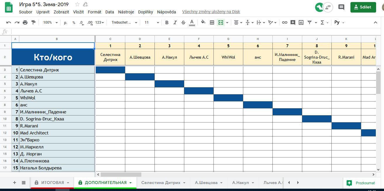 по левому столбцу и верхней горизонтали располагаются участники. В левом столбце те, кто читает произведения тех, кто написан по верхней горизонтали. На пересечении появляется суммарный балл, поставленный отзывантом из первого столбца произведению игрока из «шапки».