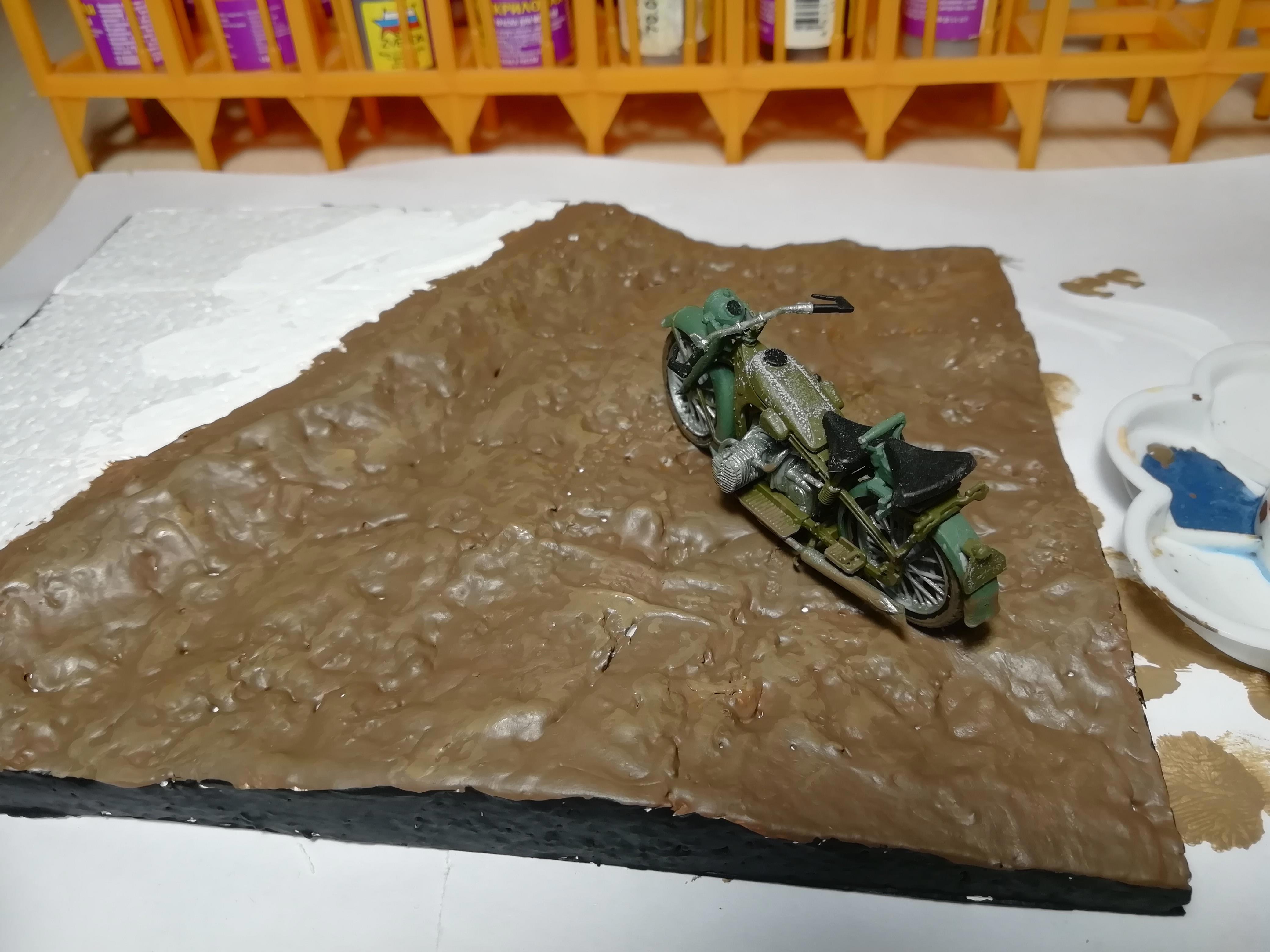 Подставка собрана и обляпана грязью дорог (мотоцикл и ботинки персонажей - тоже). Ждём-с, когда высохнет, чтобы ушёл блеск.