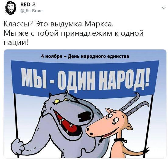 Автор: VictorRПока что я никакого праздника не ощущаю. И не только я, для подавляющей массы граждан России этот день так и не стал праздником, остался в роли всего лишь выходного. Что забавно - даже ярые антикоммунисты его за праздник как-то не признают, во всяком случае, не замечал я у этих персонажей искренних чувств в этот день, максимум - отрабатывают зарплату... Ну, потому что обе стороны "единения" чётко понимают, что единство ограбленных с грабителями - это бред.