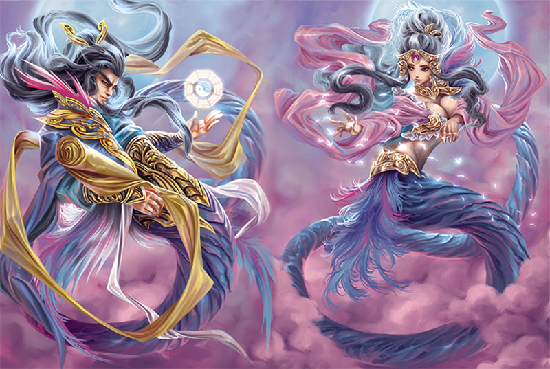 Одна из древних легенд гласит, что далеко к северо-западу от Китая была страна, которая называлась Страной рода Хуасюй. В той стране не было ни правителей, ни вождей, люди не были подвержены страстям и потому все жили долго, красиво и весело. Жители этой страны могли ходить по воде и не тонуть, проходить через огонь и не гореть, летать по воздуху также, как и свободно ходить по земле. Их не пугали раскаты грома, они могли видеть в тумане и в темноте. Это были люди божественные и одновременно земные, но бессмертные. В этой стране жила девушка. Она не имела имени, а звали ее Хуасюй-ши, что означает урожденная страны Хуасюй. Как-то она пошла погулять к огромному Озеру грома и увидела на берегу следы ног какого-то великана. Шутки ради она наступила на этот след и тут же забеременела. Этим великаном был дух Озера грома, существо с человеческой головой и телом дракона. У меня вот сразу возник вопрос: а что это за Озера грома такое? Грохочущее озеро, в которое били молнии во время грозы? Почему жители страны Хуасюй не были похожи на китайцев, имели светлую кожу, светлые (голубые или зеленые) глаза и светлые волосы. Возможно благодаря этому мифу благородные дамы всячески выбеливали кожу, чтоб подтвердить божественные корни своего рода. А девушки с глазами цвета воды и листвы считались чем-то из ряда вон, и ценились особо. В общем девушка из мифической страны забеременела и родила детишек с змеиными хвостами. Что еще интересно? Ньюва всегда змея. А вот Фуси часто имеет лапки или крылья, или и то и другое сразу. В некоторых мифах он описан, как птица или летучий змей. Чем еще интересна эта парочка вместе? Они олицетворяют жизнь и смерть. Фуси считается загробным божеством, в то время как Ньюва богиня рождения. Она не только создала людей, но еще и научила их размножаться и много чему еще.