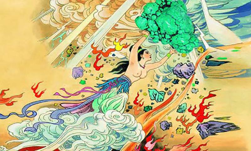 Адама и Евы у китайцев не было, а вот потоп был, впрочем, как и у других народов мира. Земля дрогнула, разнося грохот по всему свету; небо раскололось, явив зияющую пропасть, засверкали молнии, и на землю рекой хлынула вода. Земля разошлась паутиной трещин, рушивших все на своем пути, и из них к небу драконом взвился огонь; по всей земле несся гигантский поток воды, превращаясь в безбрежный океан. Пламя уничтожало дома, посевы, леса и все, что не успело затонуть в воде; звери, лишившиеся своих жилищ, стали охотиться на людей как на самую лакомую добычу; в воздухе парили голодные хищные птицы, то и дело пикируя на слабых стариков и детей, что не могли убежать, и разрывая их плоть. Воспользовавшись разразившимся бедствием, объявился и черный дракон, доселе спавший на центральных равнинах: он поднялся ввысь, заслонив своим громадным телом небо и солнце, и хватал всех людей, попадавшихся ему на глаза. Вода, огонь, хищные звери и ужасный дракон преследовали людей, и те, стеная, бежали во мраке наугад, спасаясь от смерти. Нюйва не могла равнодушно смотреть на то, как гибнут ее создания. Она пропустила через себя дыхание Вселенной и воздела руки к расколотому небу. В одно мгновение бесчисленное множество камней пяти разных цветов поднялись ввысь из воды, из горящих лесов, из нетронутой потопом земли, и мириады разноцветных лучей света, пронзив непроглядную тьму и грозное небо, сошлись в одной точке и устремились к земле перед Нюйвой. Богиня призвала молнию, чтобы расплавить камни, этим сплавом она закрыла дыры на небе.
