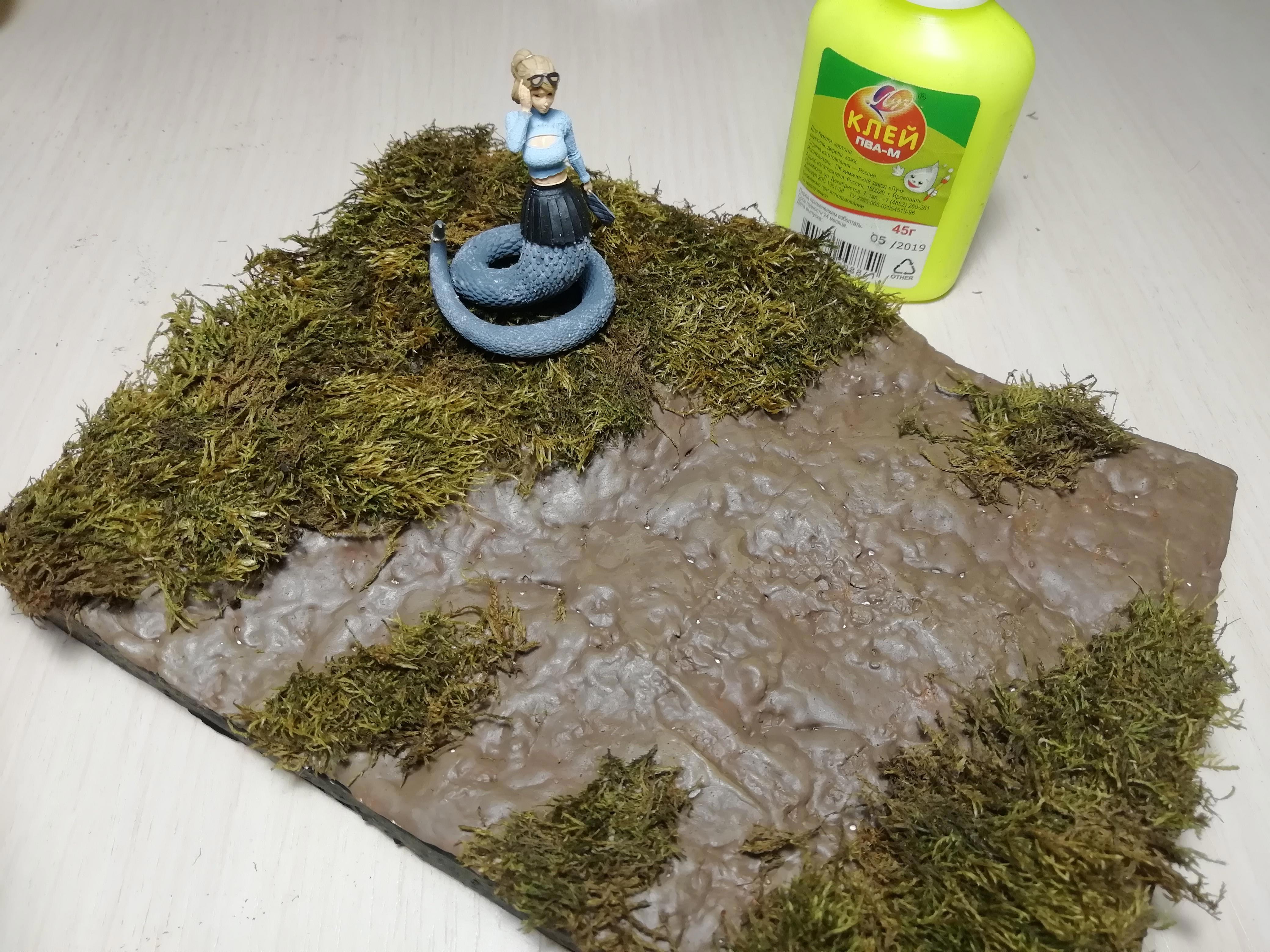 Диорама обзавелась травой. А вот грязь мне не нравится - блеска многовато. Придётся пройтись ещё одном слоем жидкой краски, щедро добавив туда талька :)