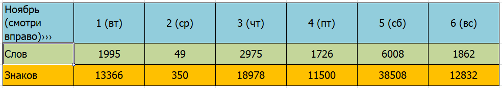 Покажу вам, чего вышло за первую недонеделю. В знаках мне привычнее, и вот это "количество слов", если честно, прям подбешиват.