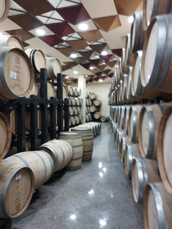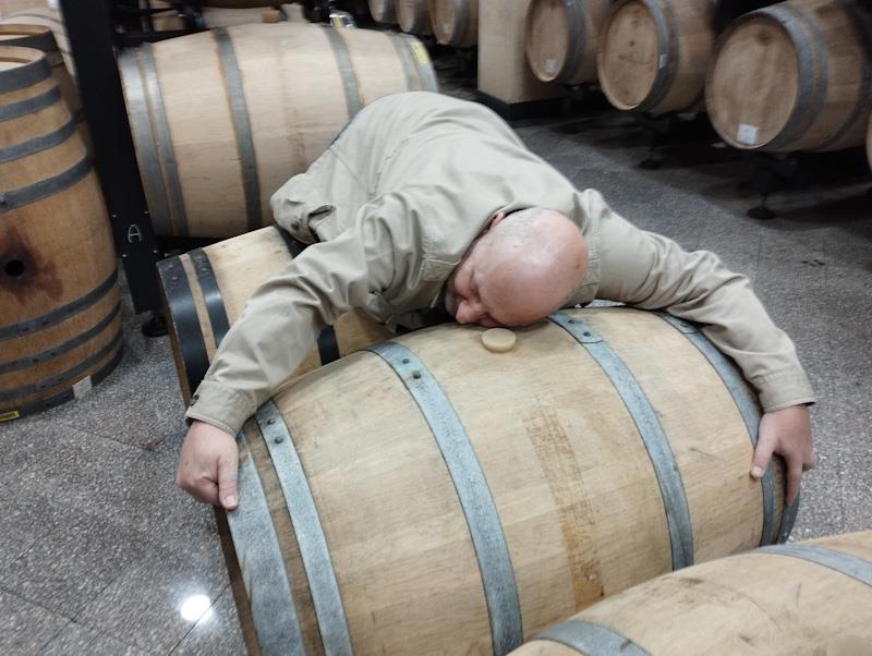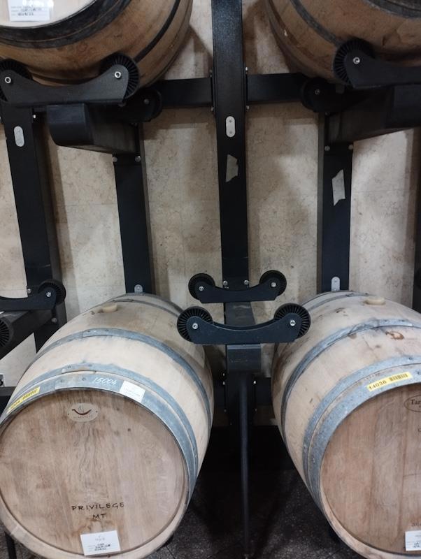 Вот «подвал» винодельни, никаких пирамид из бочек — каждая стоит, опираясь на колесики. Каждая имеет маркировку со штрих-кодом, так что работники винодельни легко определяют, какую бочку и на сколько градусов надо повернуть. Ну и не пора ли ее вообще вынимать, а то результат созревания будет отличаться от ожидаемого.