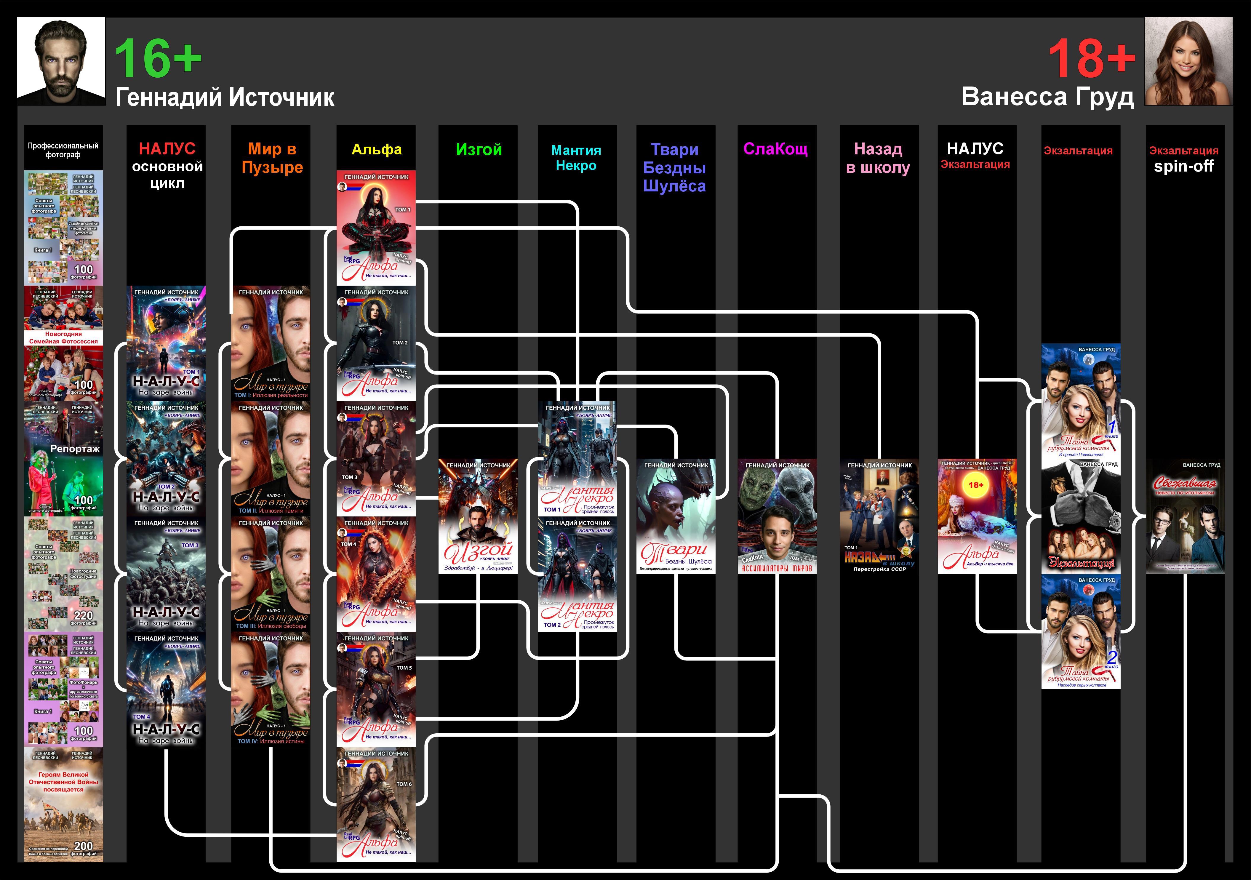 Автор: Геннадий ИсточникВзаимосвязь всех романов и переплетение циклов книг во вселенных НАЛУС и Экзальтация