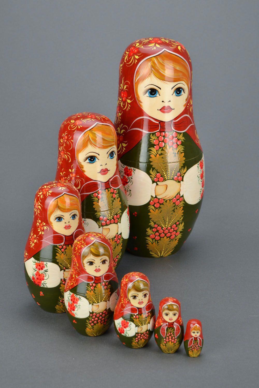 Матрёшка — русская деревянная игрушка в виде расписной куклы, внутри которой находятся подобные ей куклы меньшего размера. Число вложенных кукол — обычно три и более. Обычно имеют форму яйца с плоским донцем и состоят из двух разъёмных частей, верхней и нижней.