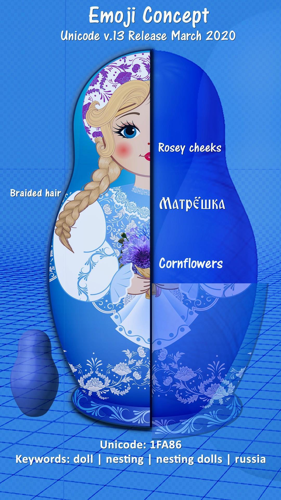 В марте 2020 года Консорциум Юникода утвердил матрёшку в качестве нового символа в Emoji 13.0[6]. Матрёшка была представлена Джефом Греем как нерелигиозный или политический символ восточноевропейской культуры[8]. Символ получил кодовую позицию U+1FA86 🪆 nesting dolls.