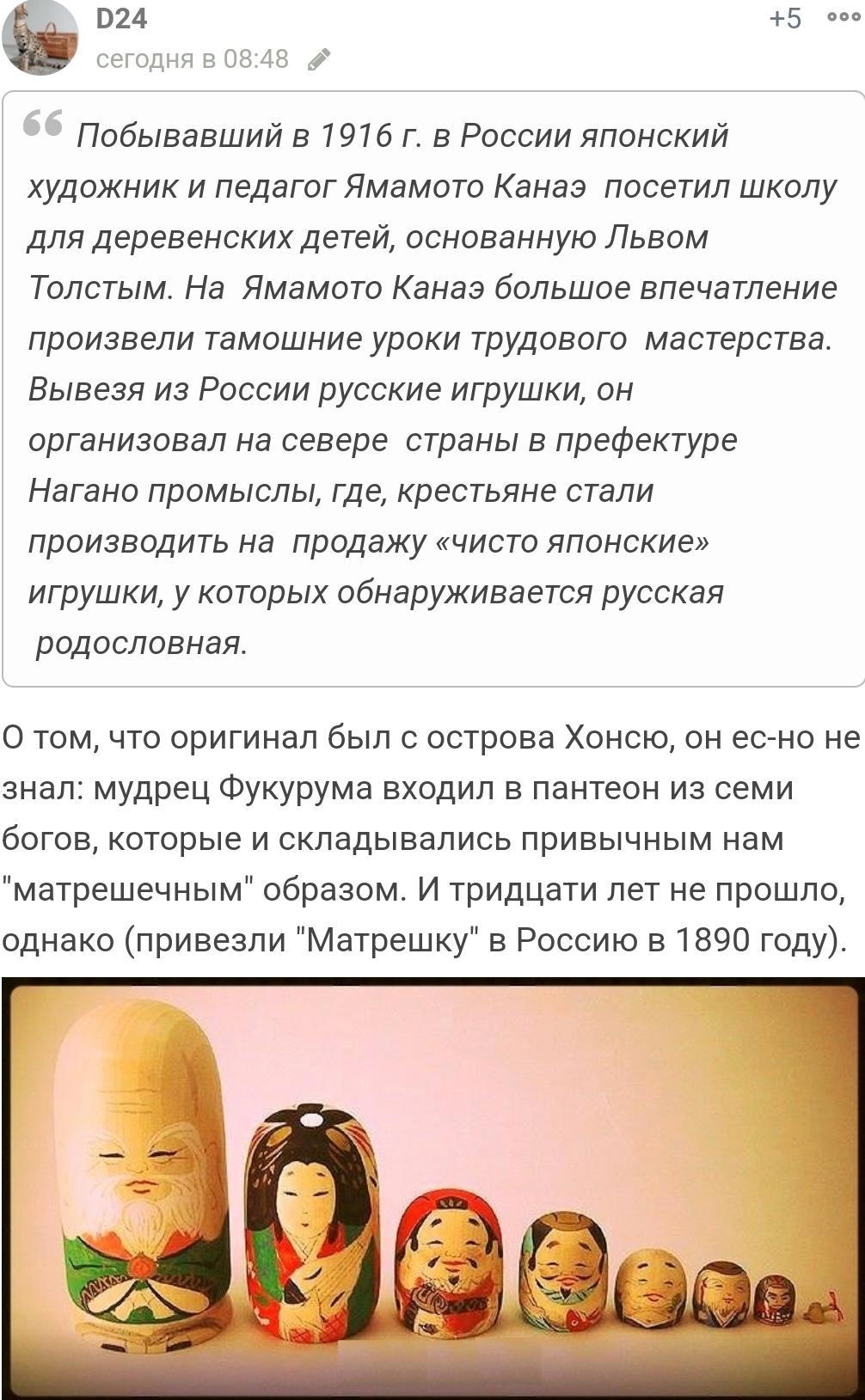 Побывавший в 1916 г. в России японский художник и педагог Ямамото Канаэ посетил школу для деревенских детей, основанную Львом Толстым. На Ямамото Канаэ большое впечатление произвели тамошние уроки трудового мастерства. Вывезя из России русские игрушки, он организовал на севере страны в префектуре Нагано промыслы, где, крестьяне стали производить на продажу «чисто японские» игрушки, у которых обнаруживается русская родословная.