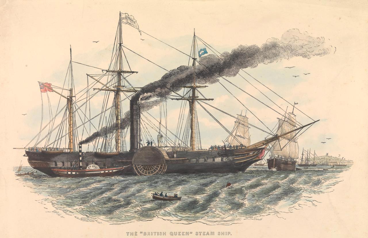 Однако в Англии были люди, которые понимали, какие преимущества для трансатлантического судоходства может дать использование силы пара. Уже в 1837 году в этой стране создаются первые пароходные компании, суда которых обслуживают срочные грузовые и пассажирские линии между английскими и американскими портами. Первой такой компанией в Англии была «Бритиш энд Америкен Стим Навигейшн Компани», которая начала строить деревянный колесный пароход «Бритиш Куин». Это судно длиной 82,3 метра могло принять в свои трюмы семьсот пятьдесят тонн угля и пятьсот тонн груза.