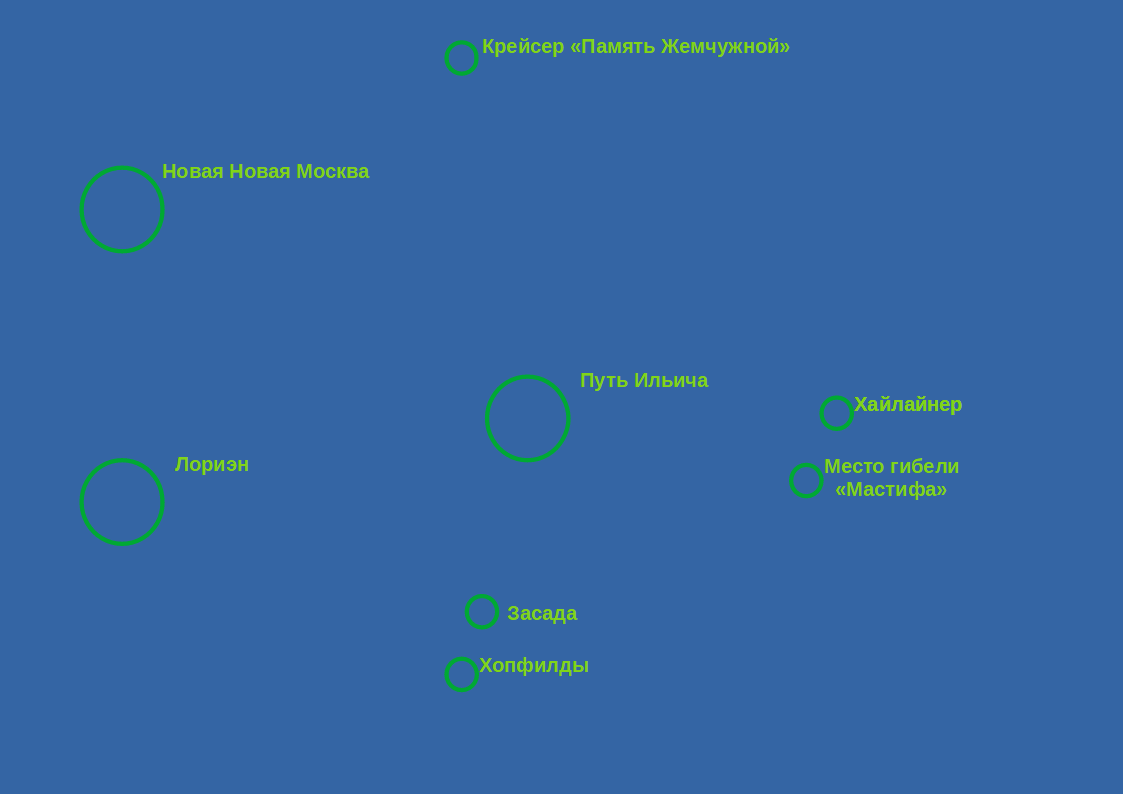 Автор: Михаил Юрьевич СалтыковПобыстрому сваял в либрофисе. Идея взята из классических фоллаутов. Большой зеленый круг — «город» в смысле сфера Бернала, маленький — все остальные локации. Разумеется, это космос и все движется, но на первые 2-3 алки карта актуальна, за исключением хайлайнера, улетевшего в самом начале. Крейсер — тот самый с которого прилетела «кавалерия», на сферах Новая Новая Москва и Лориэн персонажи еще не бывали.