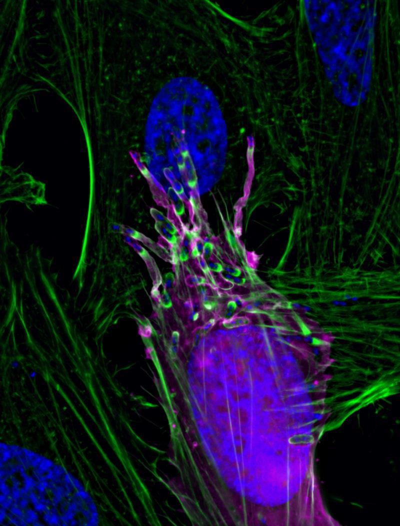 Патогенные бактерии Shigella flexneri, распространяющиеся наружу из инфицированной клетки.