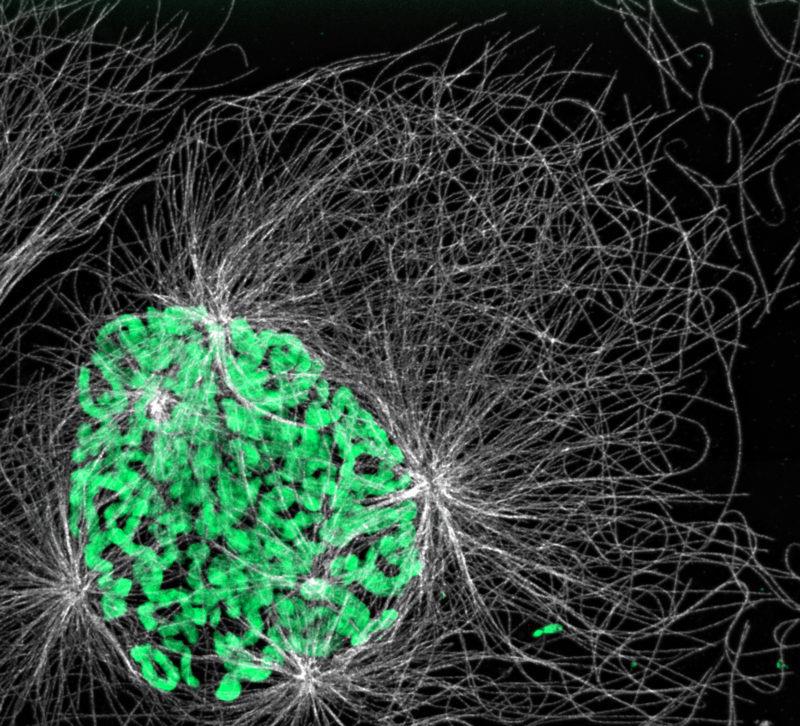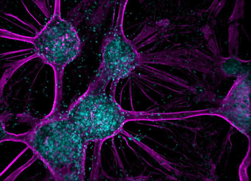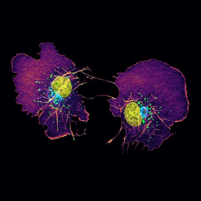 Клетки почек африканской зеленой обезьяны (COS-7) с Гольджи (синие), лизосомами (зеленые), актиновым цитоскелетом (пурпурный) и ядрами (желтый).