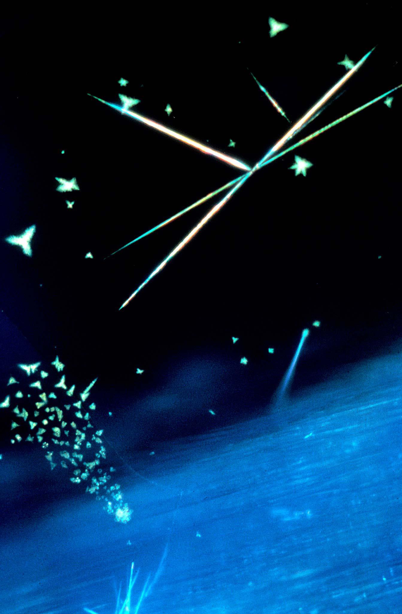 Кристаллы рутила (диоксид титана) и тридимита (полиморф кварца) в богатом кобальтом стекле, 1977 год. 1 место.