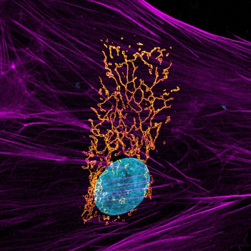 Мигрирующий фибробласт человека, окрашенный на Гольджи (оранжевый), актиновый цитоскелет (пурпурный) и ядро (голубой).