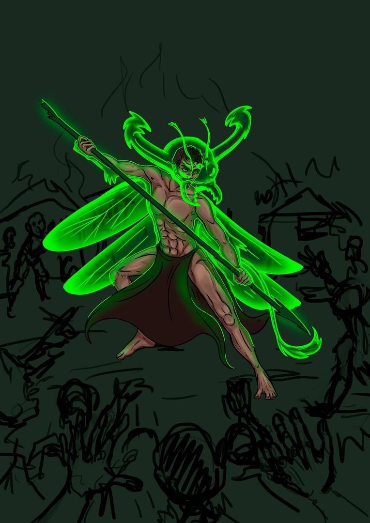 В рамках сеттинга на Земле произошел демонический апокалипсис, чудовищ пришло много всяких, и вот эти насекомые - одни из них. Тараканиха, как истинная заботливая тетка, водила за собой полчища тараканов в поисках пропитания и защищала их, как могла. Тараканы не хищные, но таскали с собой грязь и переносили заразу, которая превращала людей в зомби. А Жук - падальщик, и питается зомбарями. Съев их немереное количество, смог принимать человеческую форму, и на картинке в спойлере выглядит почти как герой, который сражается с полчищами воскресших мертвецов. Люди, видя его, слагали легенды и впрямь считали героем, не зная, что на самом деле это монстр, которому выгодно, чтобы зомбарей становилось больше.