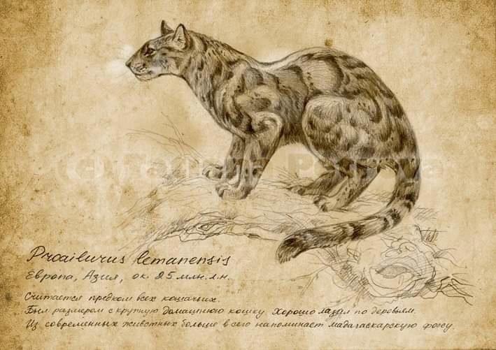 Считается, что это милейшее существо, жившее 25 миллионов лет назад, является предком всех современных кошачьих, и, возможно не только их, а так же мангустов и гиен. Зверек был чуть крупнее современной домашней кошки и несколько отличался от неё строением. Например его когти не втягивались до конца (поэтому ночами он стучал ими по полу, как мой кот, который, по ходу, тоже не до конца эволюционировал) и наступали на стопу полностью, а не кончики пальцев.