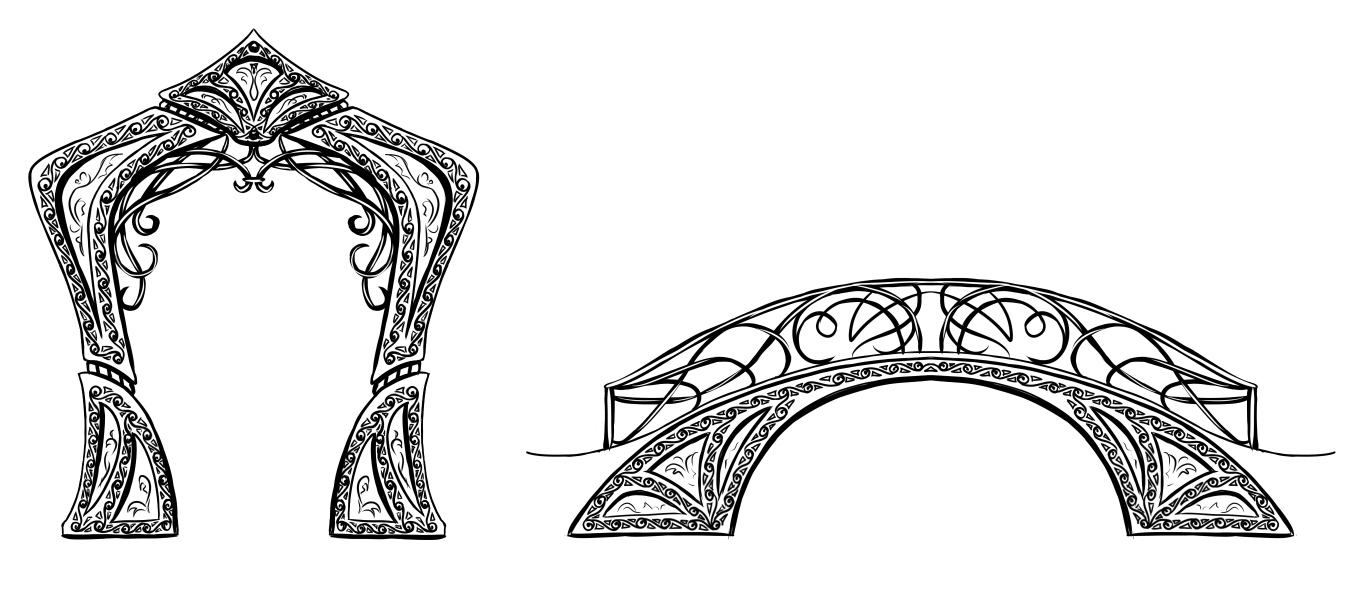 Это набросок строений для эльфийского сада к "Берегу живых" (да, там не только Египет ;). Здесь есть косяки с узором и парой других моментов, но исправлять их не буду, иначе лекарство станет ядом. Для формы вдохновлялась ар-нуво, узоры - кельтика, решётки - просто какие-то завитушки абстрактные.