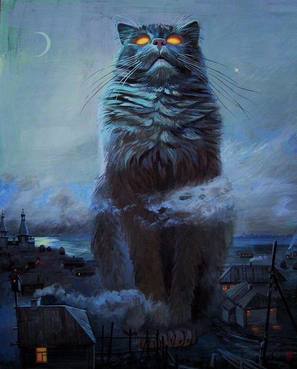 Кот подошёл к краю печи и прыгнул оттуда прямо на спину лежащего лицом в пол, при этом быстро увеличиваясь на лету и став ростом чуть ли не с приволоченного Водяным подарка.
