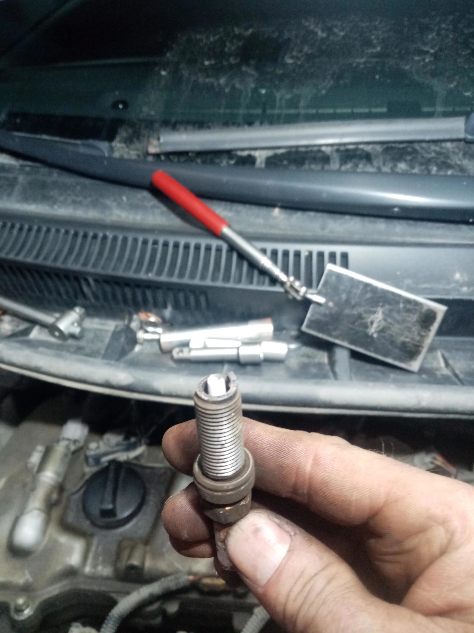 Третья и четвертая свеча такие-же как первая. Зазор между электродами ~2 миллиметра, вместо 1.1. Вторая просто в ауте, нет бокового электрода и центральный обгорел, катушка просто в труху. Смешно, но это ездило, и даже не троило. Видимо ездило оно на нерушимой надёжности Тойоты. При этом, владелец говорит, что менял свечи полтора года назад, пробег у него в год 3-4 тысячи км. А свечи выглядят на пробег в 100 000км. Либо кто-то ездит сутками, пока он не видит, либо когда он менял свечи ему их не поменяли. Кто-то положил себе в карман запчастей на 4 тысячи рублей.