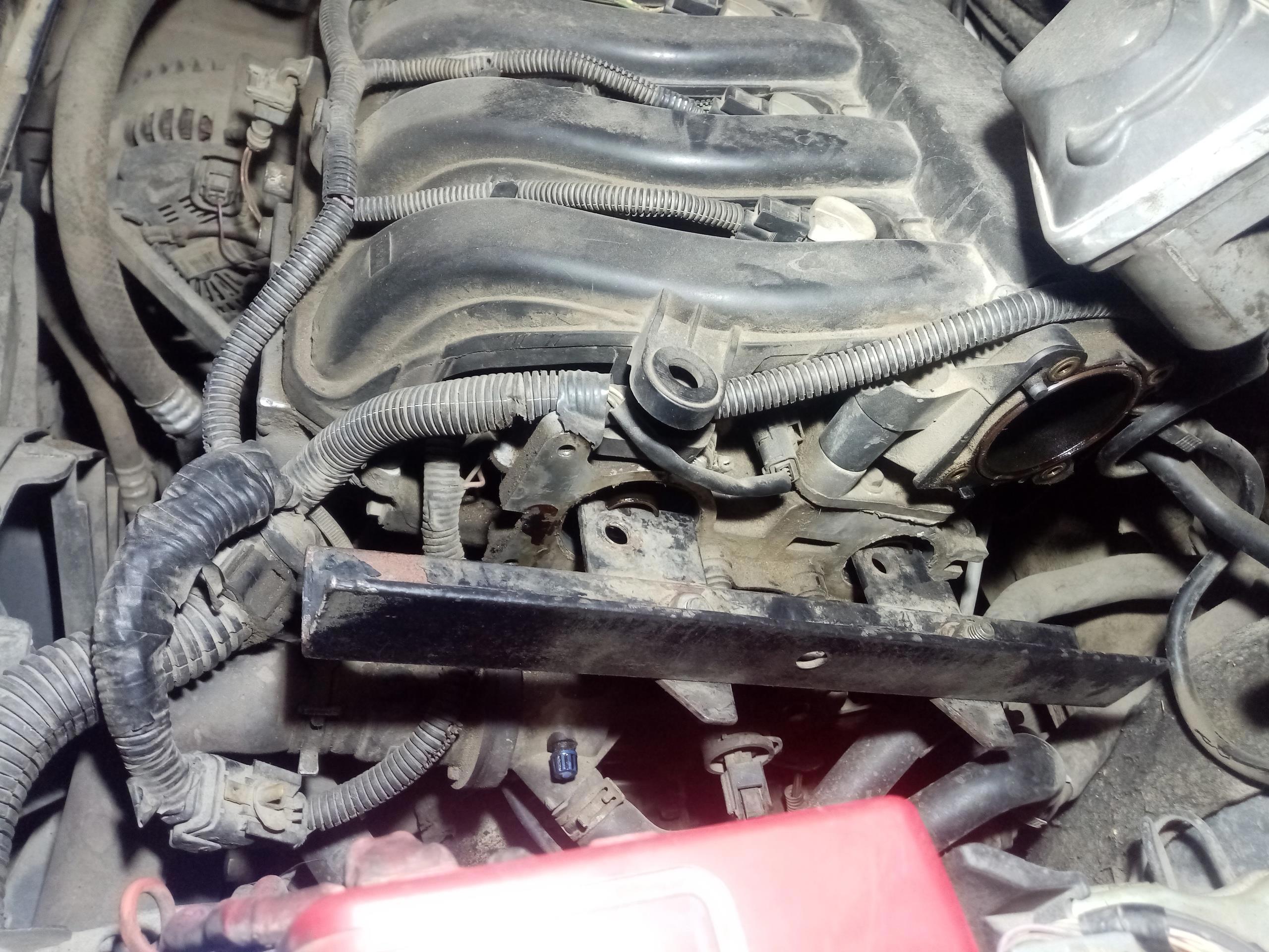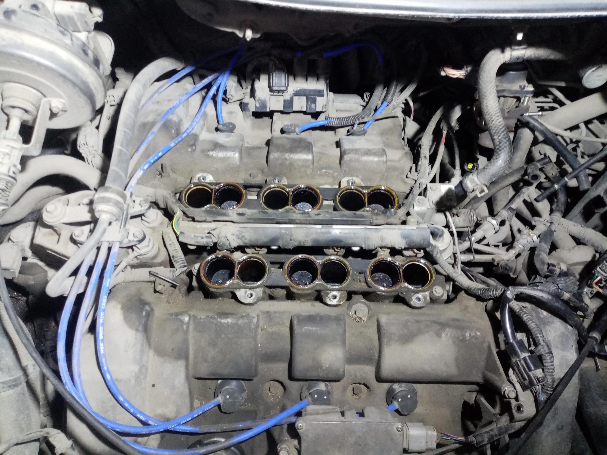 Задача простая - заменить прокладки клапанных крышек. Вы клапанные крышки видите? А они там есть. Надо только немного копнуть внутрь. Столько всякого барахла на моторе я ещё не видел! И всё это надо отцепить, открутить, убрать в сторону. Тадам! Верхняя часть коллектора снята.