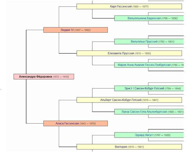 Итак: по матери Александра Федоровна имеет Алису Гессенскую (Великобританскую) у которой родители были: