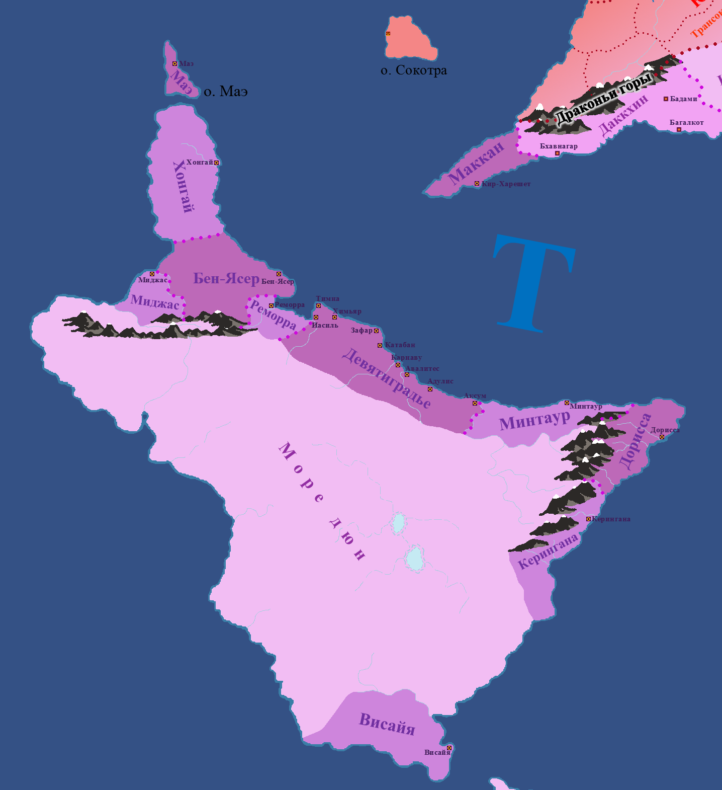 Континент пустынный, напичканный кучей городов-государств и объединений вокруг них. Географически - смесь земной Австралии и Аравии (здоровенная пустыня и населённое побережье). Исторически - ещё и нечто вроде Финикии, потому как хиспанцы на своих кораблях разве что кругосветного путешествия не совершили, описав большую часть известных земель.