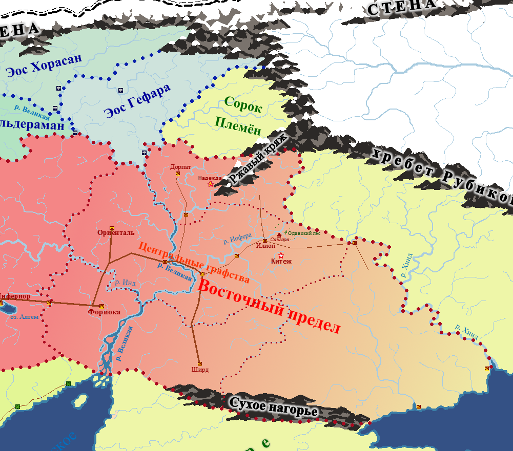 Здоровенный кусман на юго-востоке формально имперский, де-факто - имперцы в эту область карты просто свой флажок воткнули, но ещё толком не осваивали. За Хиндом земли нет на самом деле отнюдь не безжизненные пустоши - необитаемы они исключительно по меркам имперцев, а так там есть и государства, и множество племён, и довольно крупные города.